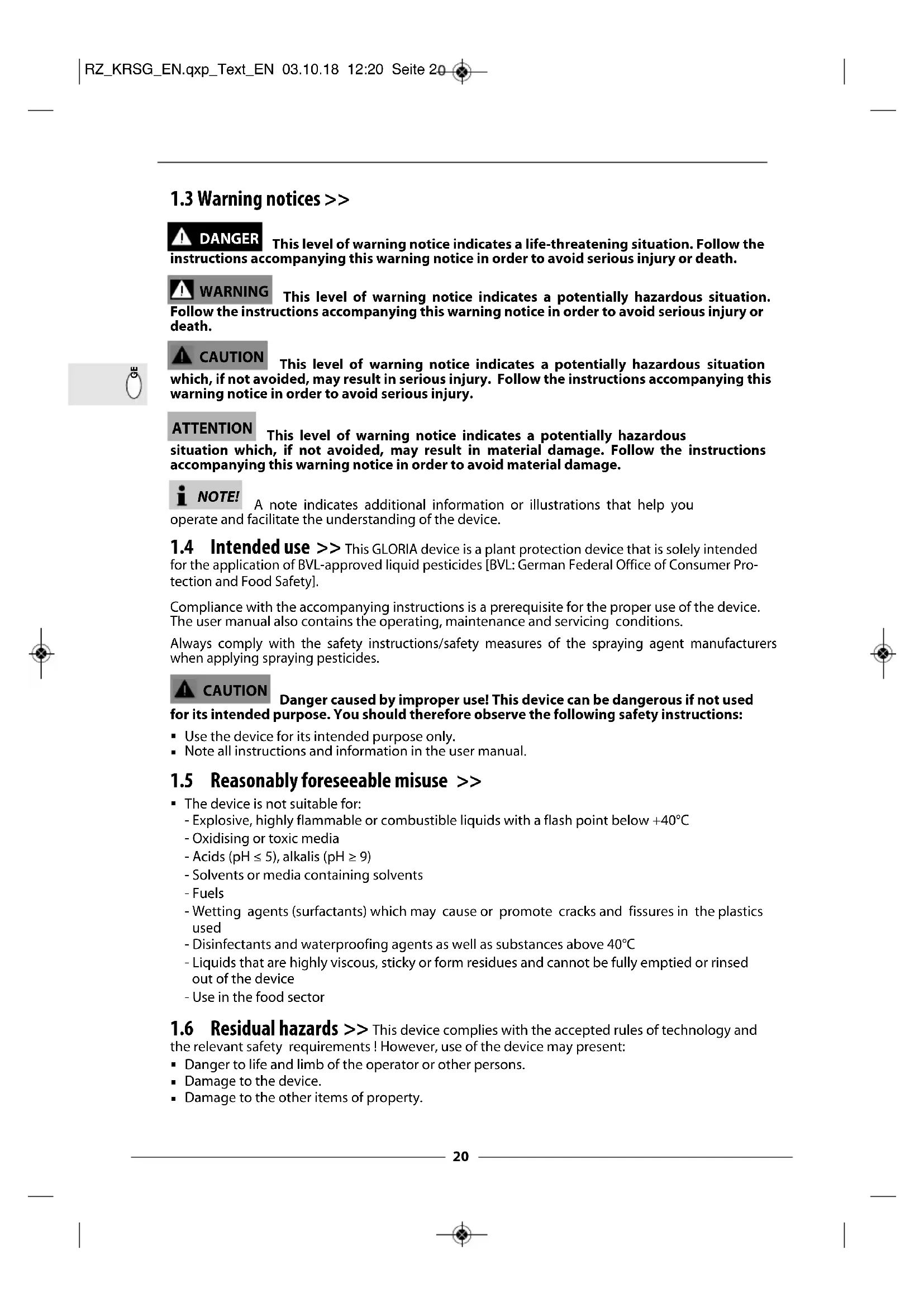 Intended use >> This GLORIA device is a plant protection device that is solely intended for the application of BVL-approved liquid pesticides [BVL: German Federal Office of Consumer Pro- tection and Food Safety]. Compliance with the accompanying instructions is a prerequisite for the proper use of the device. The user manual also contains the operating, maintenance and servicing conditions. Always comply with the safety instructions/safety measures of the spraying agent manufacturers when applying spraying pesticides. Danger caused by improper use! This device can be dangerous if not used for its intended purpose. You should therefore observe the following safety instructions: