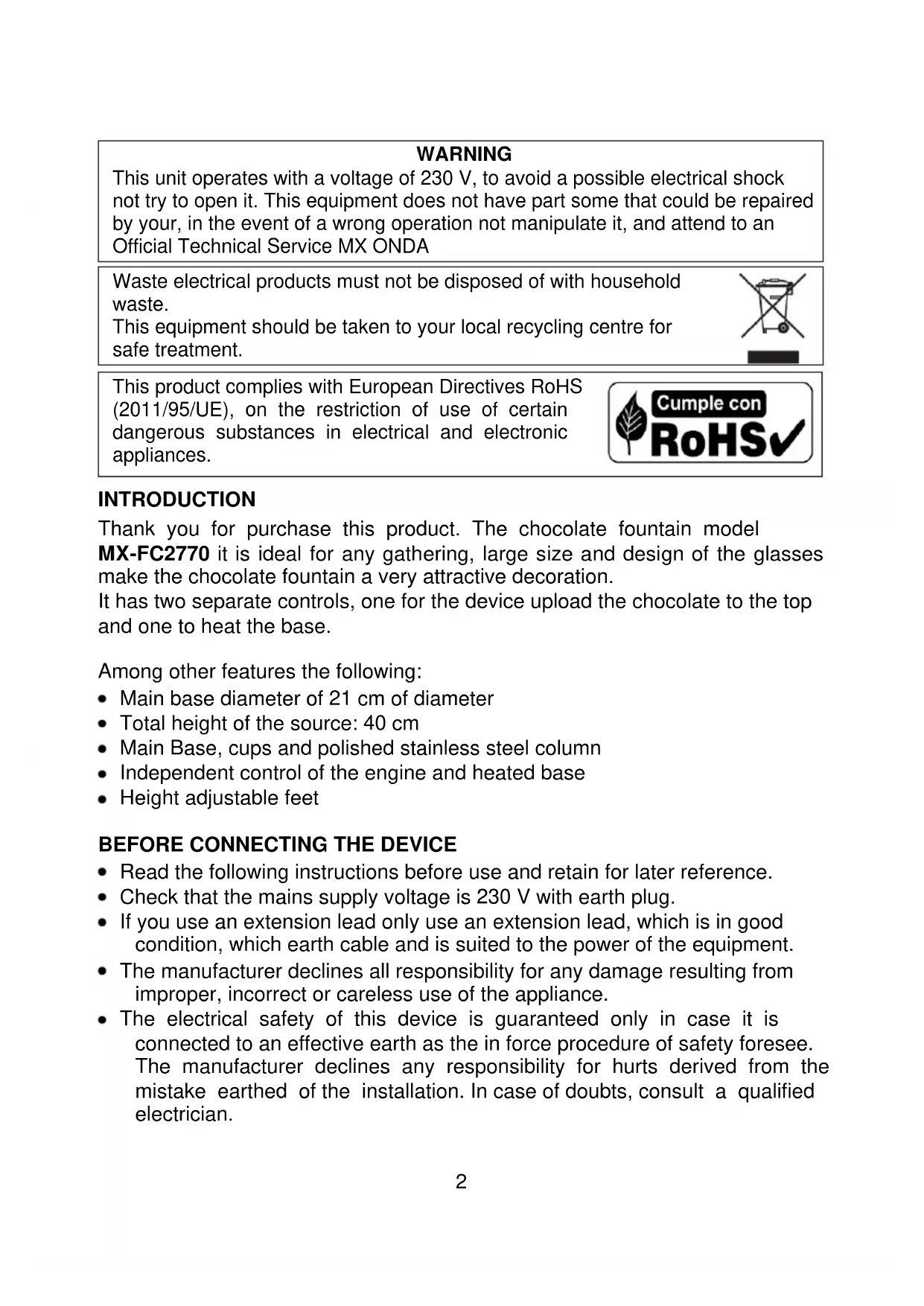 WARNING This unit operates with a voltage of 230 V, to avoid a possible electrical shock not try to open it. This equipment does not have part some that could be repaired by your, in the event of a wrong operation not manipulate it, and attend to an Official Technical Service MX ONDA Waste electrical products must not be disposed of with household waste. This equipment should be taken to your local recycling centre for safe treatment. This product complies with European Directives RoHS (2011/95/UE), on the restriction of use of certain dangerous substances in electrical and electronic appliances. INTRODUCTION Thank you for purchase this product. The chocolate fountain model MX-FC2770 it is ideal for any gathering, large size and design of the glasses make the chocolate fountain a very attractive decoration. It has two separate controls, one for the device upload the chocolate to the top and one to heat the base. Among other features the following: Main base diameter of 21 cm of diameter Total height of the source: 40 cm Main Base, cups and polished stainless steel column Independent control of the engine and heated base Height adjustable feet