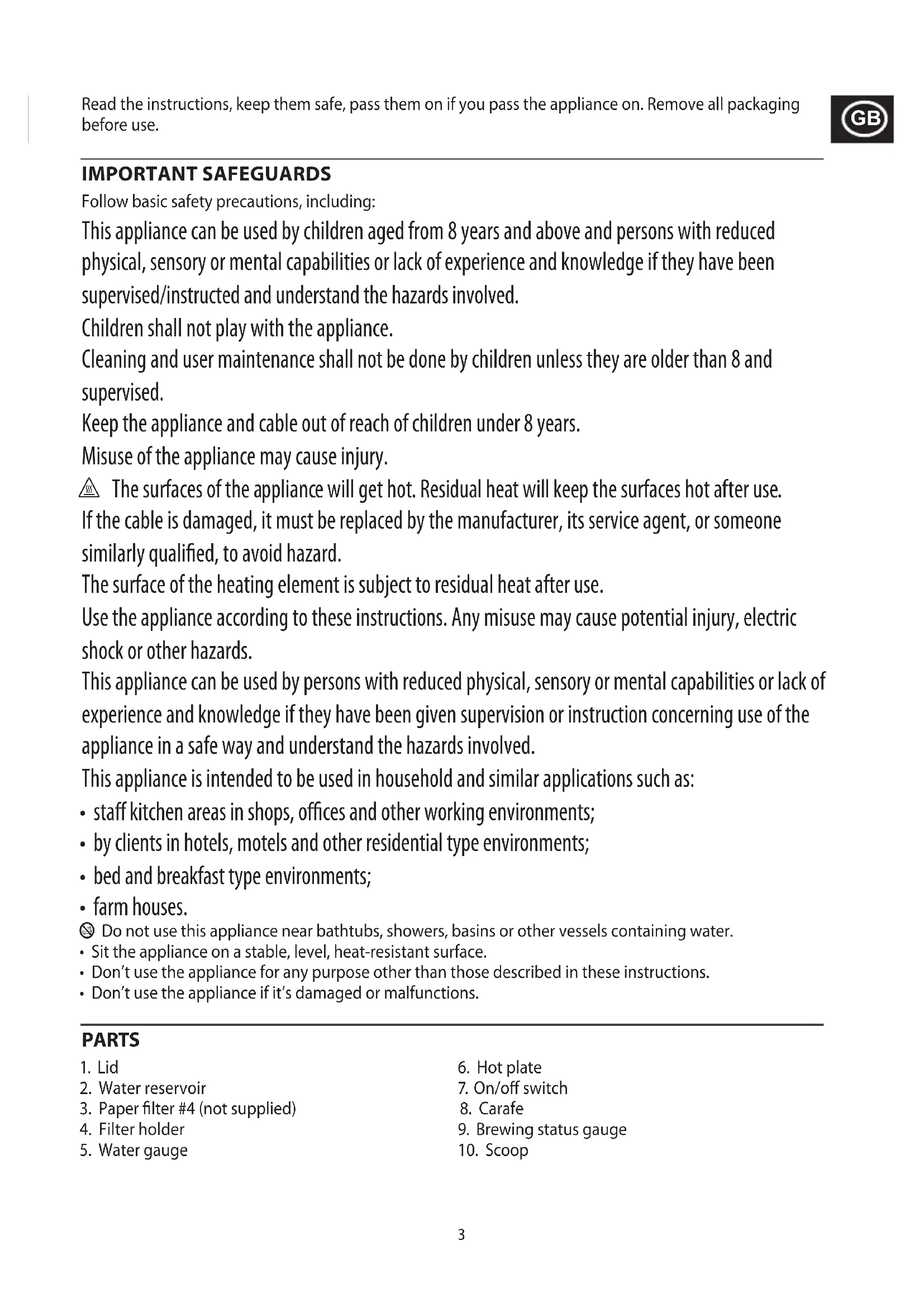Read the instructions, keep them safe, pass them on if you pass the appliance on. Remove all packaging before use. IMPORTANT SAFEGUARDS Follow basic safety precautions, including: This appliance can be used by children aged from 8 years and above and persons with reduced physical, sensory or mental capabilities or lack of experience and knowledge if they have been supervised/instructed and understand the hazards involved. Children shall not play with the appliance. Cleaning and user maintenance shall not be done by children unless they are older than 8 and supervised. Keep the appliance and cable out of reach of children under 8 years. Misuse of the appliance may cause injury. h The surfaces of the appliance will get hot. Residual heat will keep the surfaces hot after use. If the cable is damaged, it must be replaced by the manufacturer, its service agent, or someone similarly qualified, to avoid hazard. The surface of the heating element is subject to residual heat after use. Use the appliance according to these instructions. Any misuse may cause potential injury, electric shock or other hazards. This appliance can be used by persons with reduced physical, sensory or mental capabilities or lack of experience and knowledge if they have been given supervision or instruction concerning use of the appliance in a safe way and understand the hazards involved. This appliance is intended to be used in household and similar applications such as: