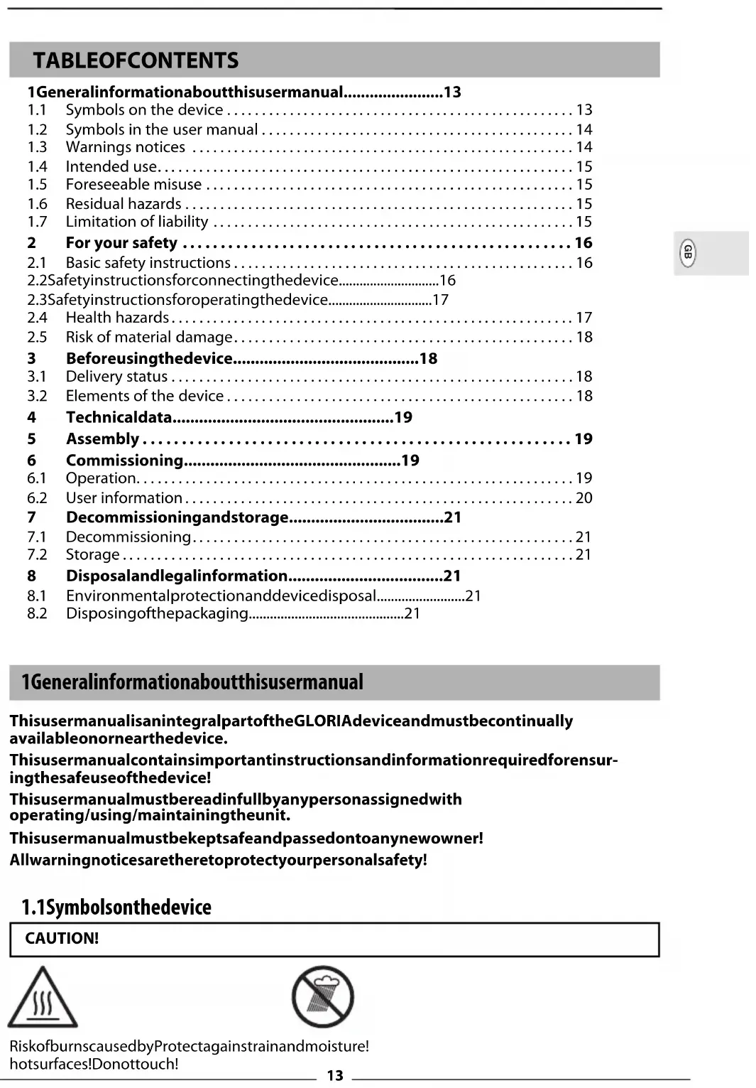Disposing of the packaging. . . . . . . . . . . . . . . . . . . . . . . . . . . . . . . . . . . . . . . . . . . . 21 1 General information about this user manual This user manual is an integral part of the GLORIA device and must be continually available on or near the device. This user manual contains important instructions and information required for ensur- ing the safe use of the device! This user manual must be read in full by any person assigned with operating/using/maintaining the unit. This user manual must be kept safe and passed on to any new owner! All warning notices are there to protect your personal safety!