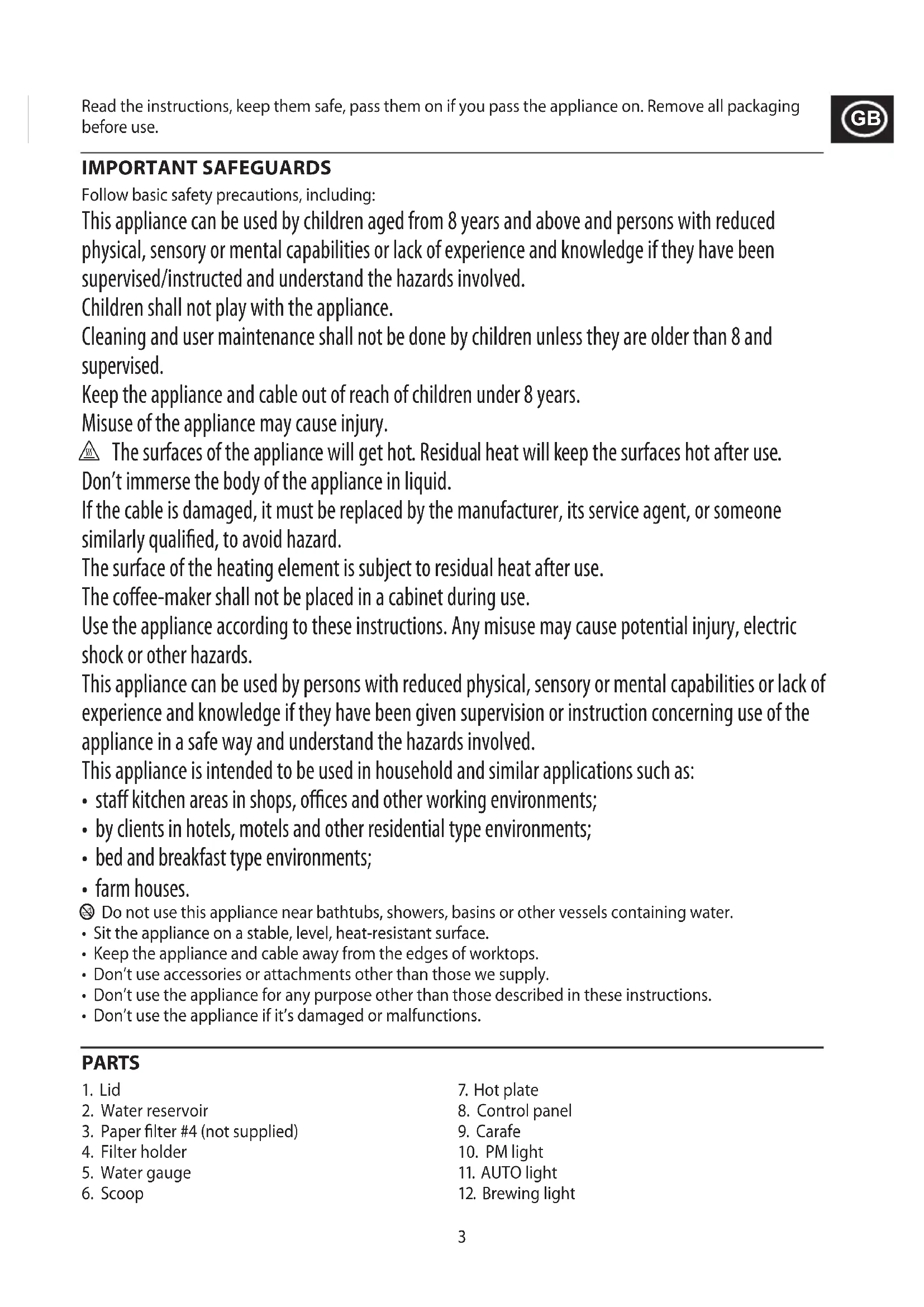 h b3 Read the instructions, keep them safe, pass them on if you pass the appliance on. Remove all packaging before use. IMPORTANT SAFEGUARDS Follow basic safety precautions, including: This appliance can be used by children aged from 8 years and above and persons with reduced physical, sensory or mental capabilities or lack of experience and knowledge if they have been supervised/instructed and understand the hazards involved. Children shall not play with the appliance. Cleaning and user maintenance shall not be done by children unless they are older than 8 and supervised. Keep the appliance and cable out of reach of children under 8 years. Misuse of the appliance may cause injury. h The surfaces of the appliance will get hot. Residual heat will keep the surfaces hot after use. Don’t immerse the body of the appliance in liquid. If the cable is damaged, it must be replaced by the manufacturer, its service agent, or someone similarly qualied, to avoid hazard. The surface of the heating element is subject to residual heat after use. The coee-maker shall not be placed in a cabinet during use. Use the appliance according to these instructions. Any misuse may cause potential injury, electric shock or other hazards. This appliance can be used by persons with reduced physical, sensory or mental capabilities or lack of experience and knowledge if they have been given supervision or instruction concerning use of the appliance in a safe way and understand the hazards involved. This appliance is intended to be used in household and similar applications such as: