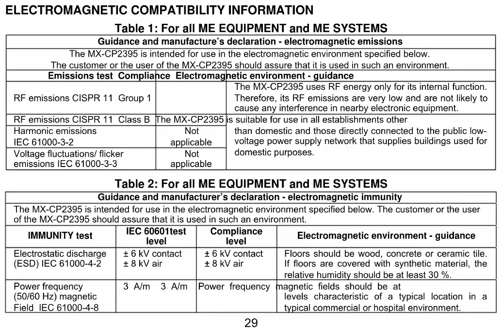 Not applicable Voltage fluctuations/ flicker emissions IEC 61000-3-3 Not applicable Table 2: For all ME EQUIPMENT and ME SYSTEMS Guidance and manufacturer’s declaration - electromagnetic immunity The MX-CP2395 is intended for use in the electromagnetic environment specified below. The customer or the user of the MX-CP2395 should assure that it is used in such an environment. IMMUNITY test IEC 60601test level Compliance level Electromagnetic environment - guidance Electrostatic discharge