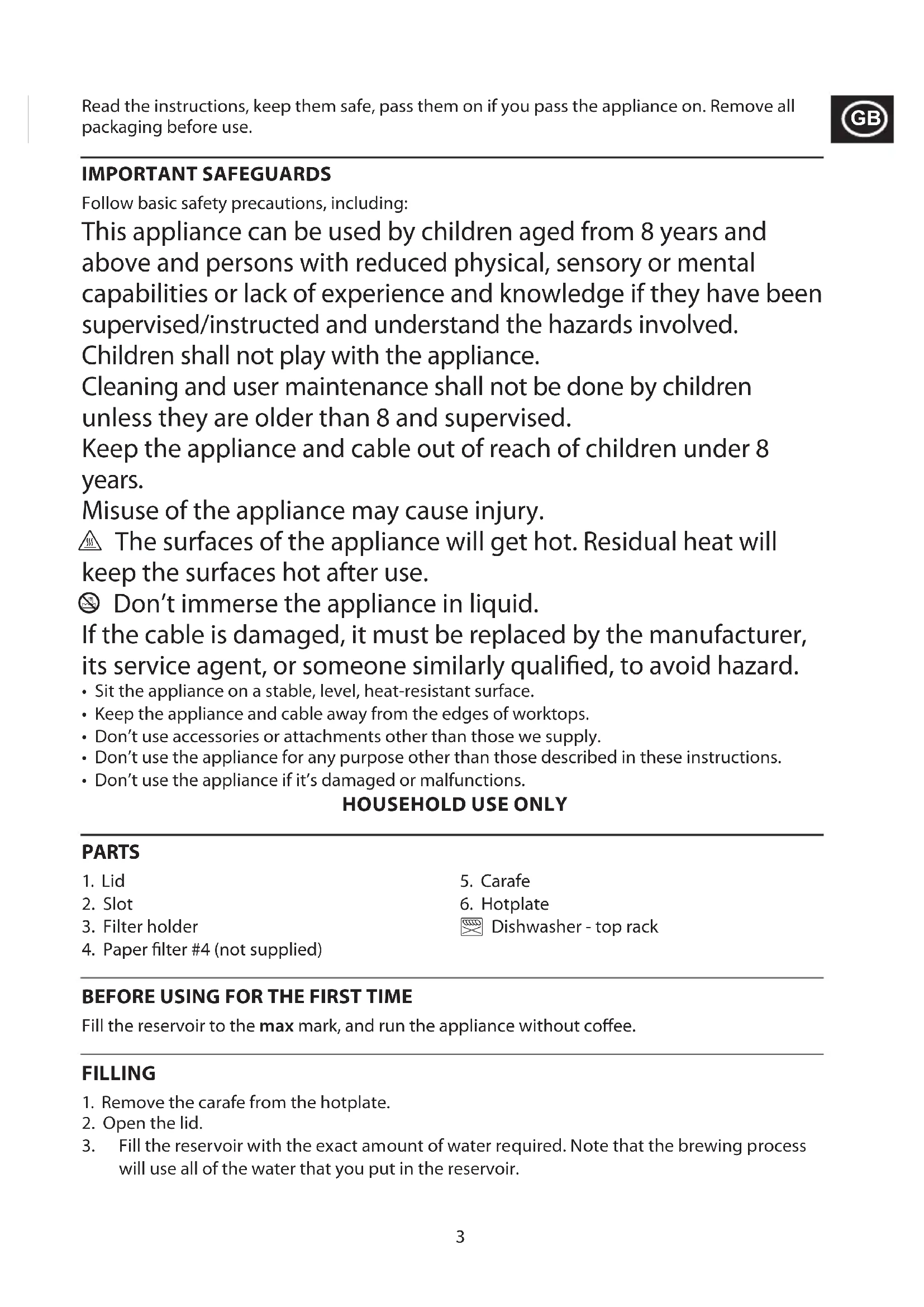 Read the instructions, keep them safe, pass them on if you pass the appliance on. Remove all packaging before use. IMPORTANT SAFEGUARDS Follow basic safety precautions, including: This appliance can be used by children aged from 8 years and above and persons with reduced physical, sensory or mental capabilities or lack of experience and knowledge if they have been supervised/instructed and understand the hazards involved. Children shall not play with the appliance. Cleaning and user maintenance shall not be done by children unless they are older than 8 and supervised. Keep the appliance and cable out of reach of children under 8 years. Misuse of the appliance may cause injury. h The surfaces of the appliance will get hot. Residual heat will keep the surfaces hot after use. l Don’t immerse the appliance in liquid. If the cable is damaged, it must be replaced by the manufacturer, its service agent, or someone similarly qualied, to avoid hazard.