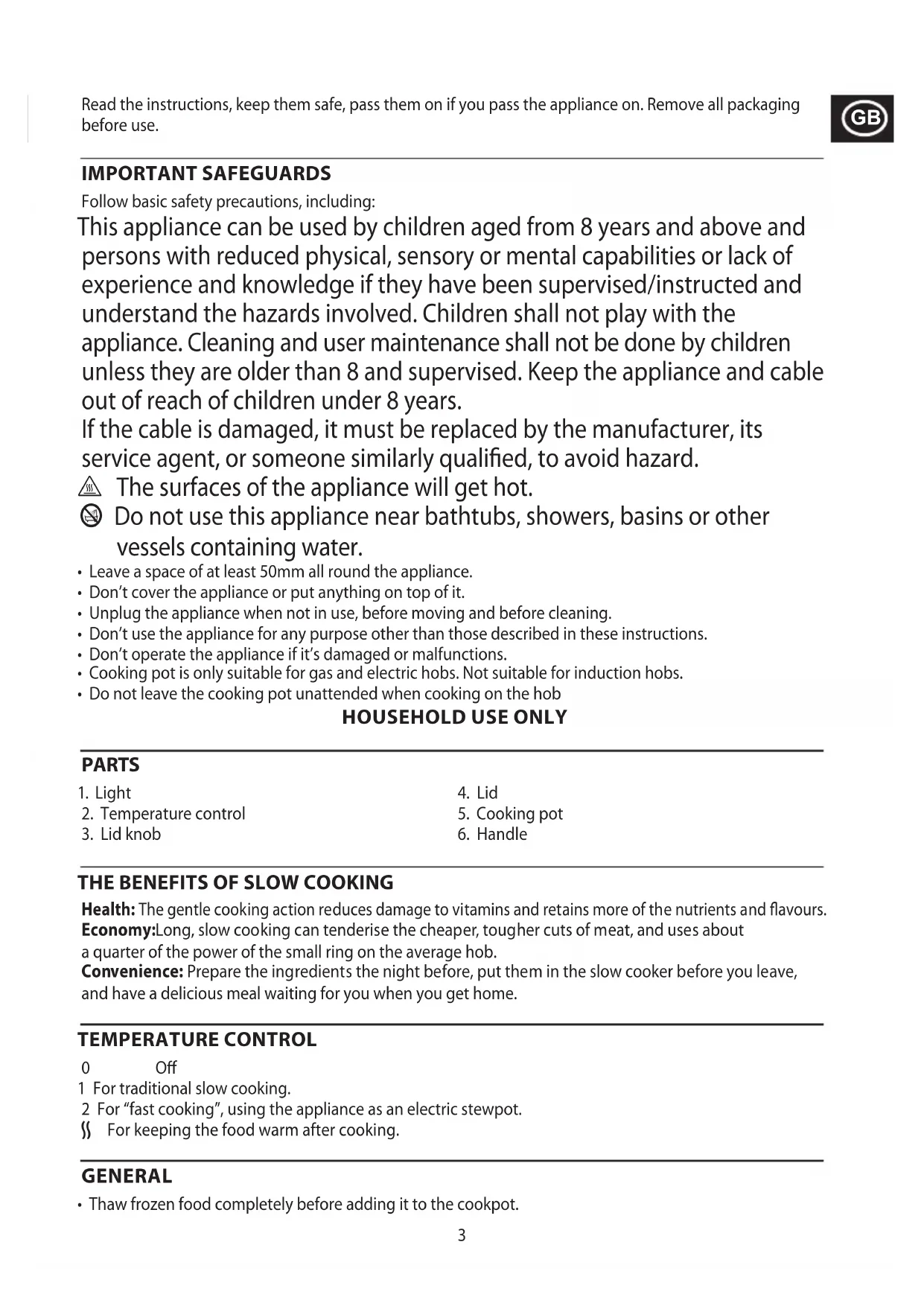 Health: The gentle cooking action reduces damage to vitamins and retains more of the nutrients and flavours. Economy: Long, slow cooking can tenderise the cheaper, tougher cuts of meat, and uses about a quarter of the power of the small ring on the average hob. Convenience: Prepare the ingredients the night before, put them in the slow cooker before you leave, and have a delicious meal waiting for you when you get home. TEMPERATURE CONTROL 0 Off 1 For traditional slow cooking. 2 For “fast cooking”, using the appliance as an electric stewpot. O For keeping the food warm after cooking. GENERAL