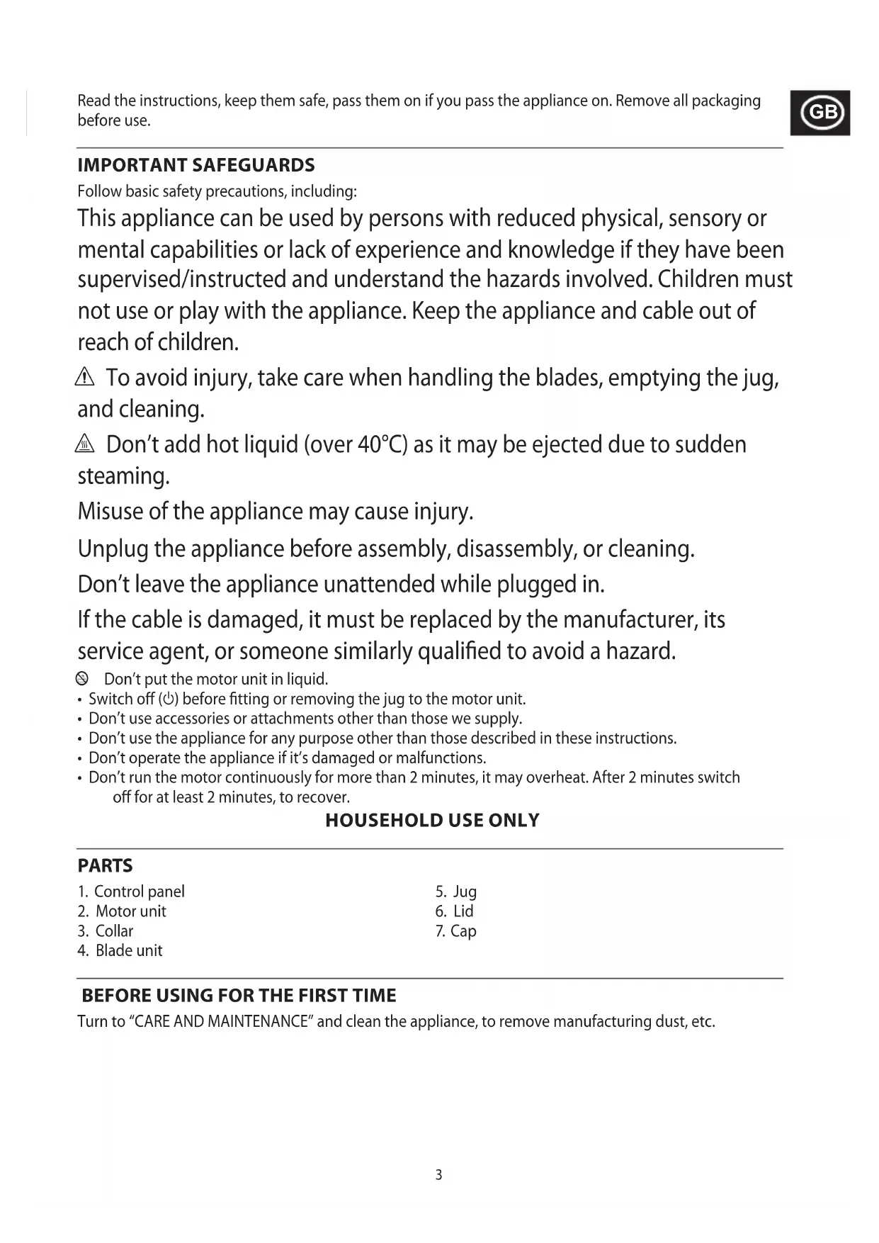Read the instructions, keep them safe, pass them on if you pass the appliance on. Remove all packaging before use. IMPORTANT SAFEGUARDS Follow basic safety precautions, including: This appliance can be used by persons with reduced physical, sensory or mental capabilities or lack of experience and knowledge if they have been supervised/instructed and understand the hazards involved. Children must not use or play with the appliance. Keep the appliance and cable out of reach of children. c To avoid injury, take care when handling the blades, emptying the jug, and cleaning. h Don’t add hot liquid (over 40°C) as it may be ejected due to sudden steaming. Misuse of the appliance may cause injury. Unplug the appliance before assembly, disassembly, or cleaning. Don’t leave the appliance unattended while plugged in. If the cable is damaged, it must be replaced by the manufacturer, its service agent, or someone similarly qualied to avoid a hazard. l Don’t put the motor unit in liquid.