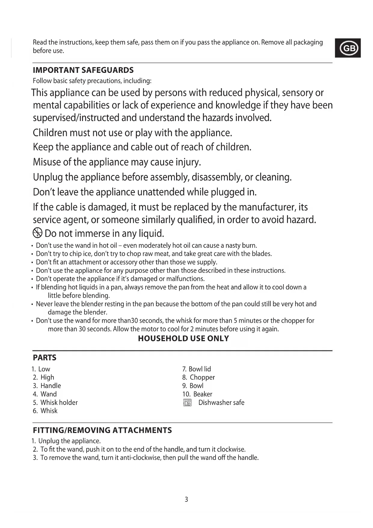 Read the instructions, keep them safe, pass them on if you pass the appliance on. Remove all packaging before use. IMPORTANT SAFEGUARDS Follow basic safety precautions, including: This appliance can be used by persons with reduced physical, sensory or mental capabilities or lack of experience and knowledge if they have been supervised/instructed and understand the hazards involved. Children must not use or play with the appliance. Keep the appliance and cable out of reach of children. Misuse of the appliance may cause injury. Unplug the appliance before assembly, disassembly, or cleaning. Don’t leave the appliance unattended while plugged in. If the cable is damaged, it must be replaced by the manufacturer, its service agent, or someone similarly qualified, in order to avoid hazard. i Do not immerse in any liquid.