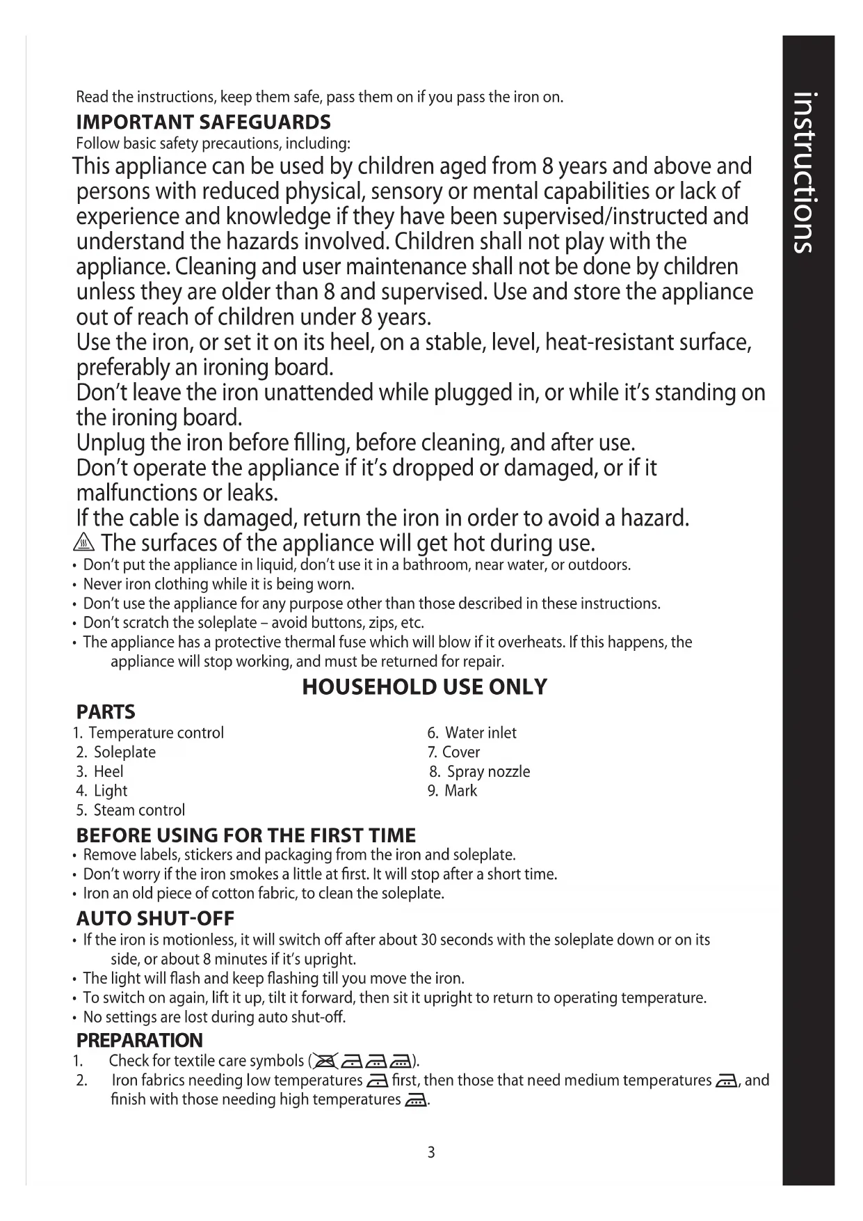max3 Read the instructions, keep them safe, pass them on if you pass the iron on. IMPORTANT SAFEGUARDS Follow basic safety precautions, including: This appliance can be used by children aged from 8 years and above and persons with reduced physical, sensory or mental capabilities or lack of experience and knowledge if they have been supervised/instructed and understand the hazards involved. Children shall not play with the appliance. Cleaning and user maintenance shall not be done by children unless they are older than 8 and supervised. Use and store the appliance out of reach of children under 8 years. Use the iron, or set it on its heel, on a stable, level, heat-resistant surface, preferably an ironing board. Don’t leave the iron unattended while plugged in, or while it’s standing on the ironing board. Unplug the iron before filling, before cleaning, and after use. Don’t operate the appliance if it’s dropped or damaged, or if it malfunctions or leaks. If the cable is damaged, return the iron in order to avoid a hazard.