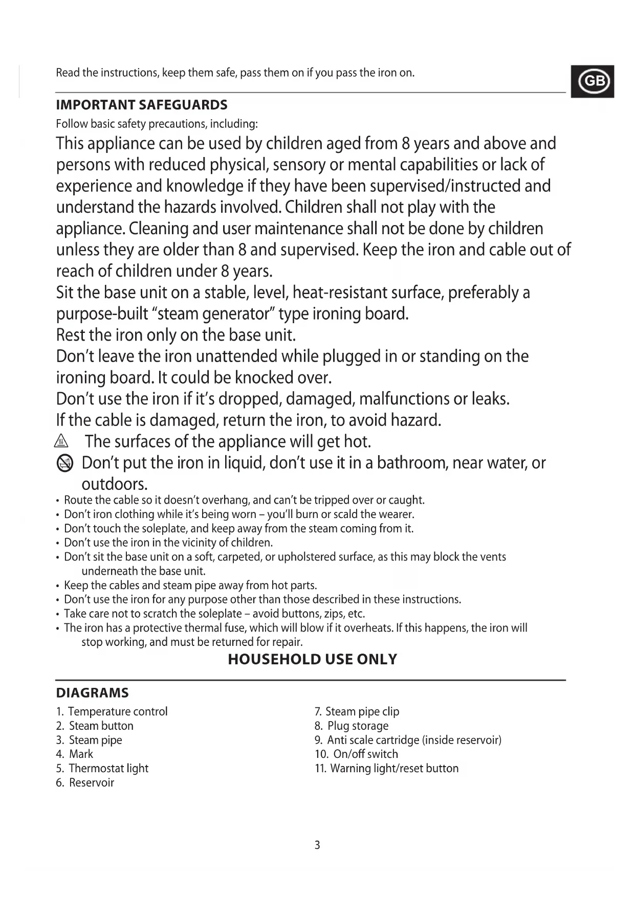 o r3 Read the instructions, keep them safe, pass them on if you pass the iron on. IMPORTANT SAFEGUARDS Follow basic safety precautions, including: This appliance can be used by children aged from 8 years and above and persons with reduced physical, sensory or mental capabilities or lack of experience and knowledge if they have been supervised/instructed and understand the hazards involved. Children shall not play with the appliance. Cleaning and user maintenance shall not be done by children unless they are older than 8 and supervised. Keep the iron and cable out of reach of children under 8 years. Sit the base unit on a stable, level, heat-resistant surface, preferably a purpose-built “steam generator” type ironing board. Rest the iron only on the base unit. Don’t leave the iron unattended while plugged in or standing on the ironing board. It could be knocked over. Don’t use the iron if it’s dropped, damaged, malfunctions or leaks. If the cable is damaged, return the iron, to avoid hazard. h The surfaces of the appliance will get hot. B Don’t put the iron in liquid, don’t use it in a bathroom, near water, or outdoors.