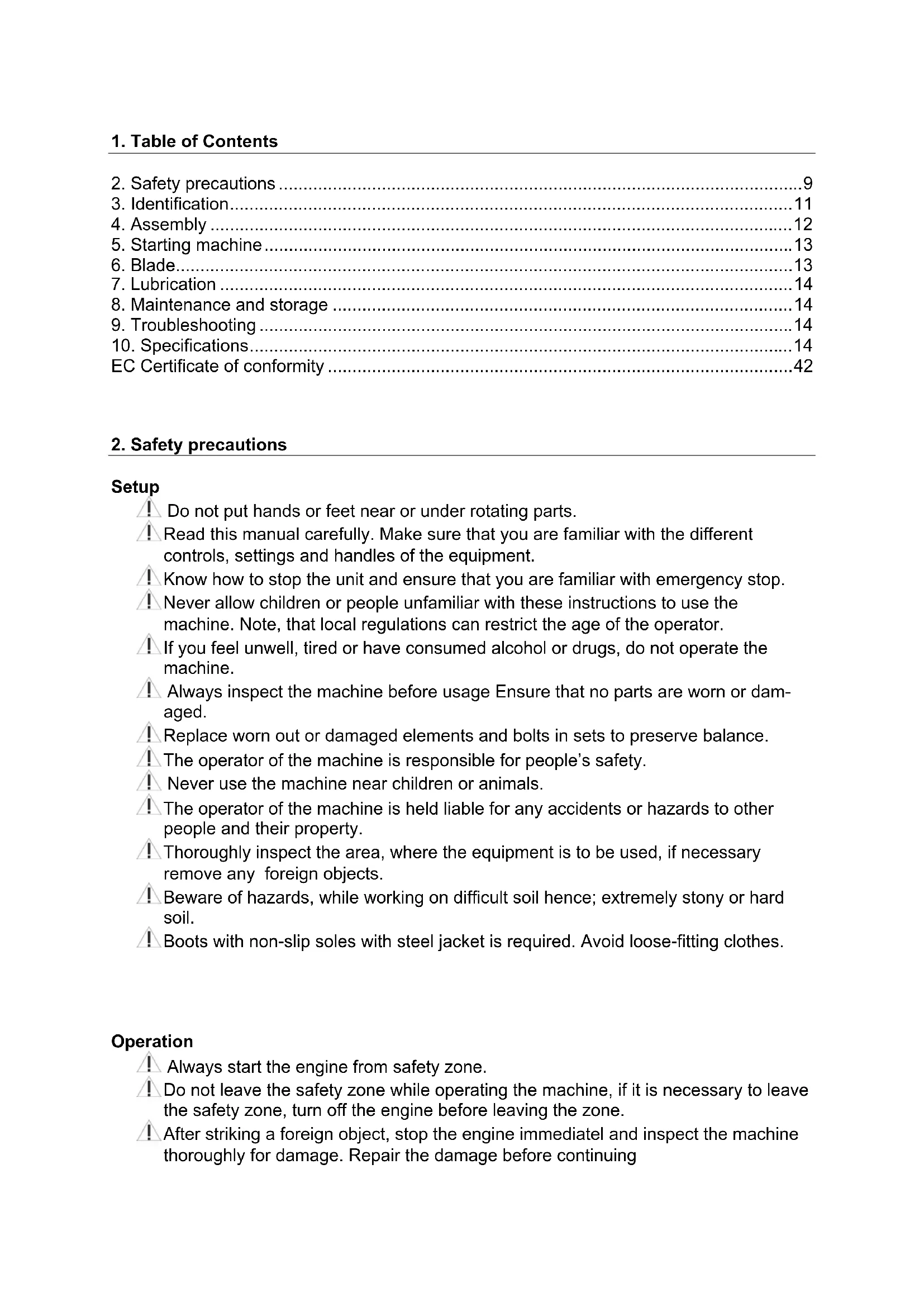Setup Do not put hands or feet near or under rotating parts. Read this manual carefully. Make sure that you are familiar with the different controls, settings and handles of the equipment. Know how to stop the unit and ensure that you are familiar with emergency stop. Never allow children or people unfamiliar with these instructions to use the machine. Note, that local regulations can restrict the age of the operator. If you feel unwell, tired or have consumed alcohol or drugs, do not operate the machine. Always inspect the machine before usage Ensure that no parts are worn or dam- aged. Replace worn out or damaged elements and bolts in sets to preserve balance. The operator of the machine is responsible for people’s safety. Never use the machine near children or animals. The operator of the machine is held liable for any accidents or hazards to other people and their property. Thoroughly inspect the area, where the equipment is to be used, if necessary remove any foreign objects. Beware of hazards, while working on difficult soil hence; extremely stony or hard soil. Boots with non-slip soles with steel jacket is required. Avoid loose-fitting clothes.