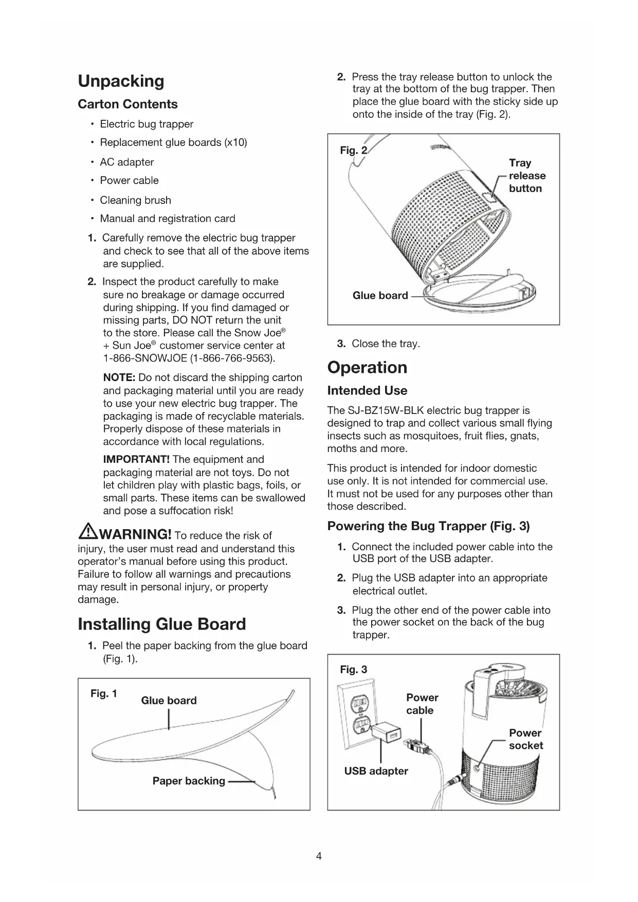 customer service center at 1-866-SNOWJOE (1-866-766-9563). NOTE: Do not discard the shipping carton and packaging material until you are ready to use your new electric bug trapper. The packaging is made of recyclable materials. Properly dispose of these materials in accordance with local regulations. IMPORTANT! The equipment and packaging material are not toys. Do not let children play with plastic bags, foils, or small parts. These items can be swallowed and pose a suocation risk! mWARNING! To reduce the risk of injury, the user must read and understand this operator’s manual before using this product. Failure to follow all warnings and precautions may result in personal injury, or property damage. Installing Glue Board
