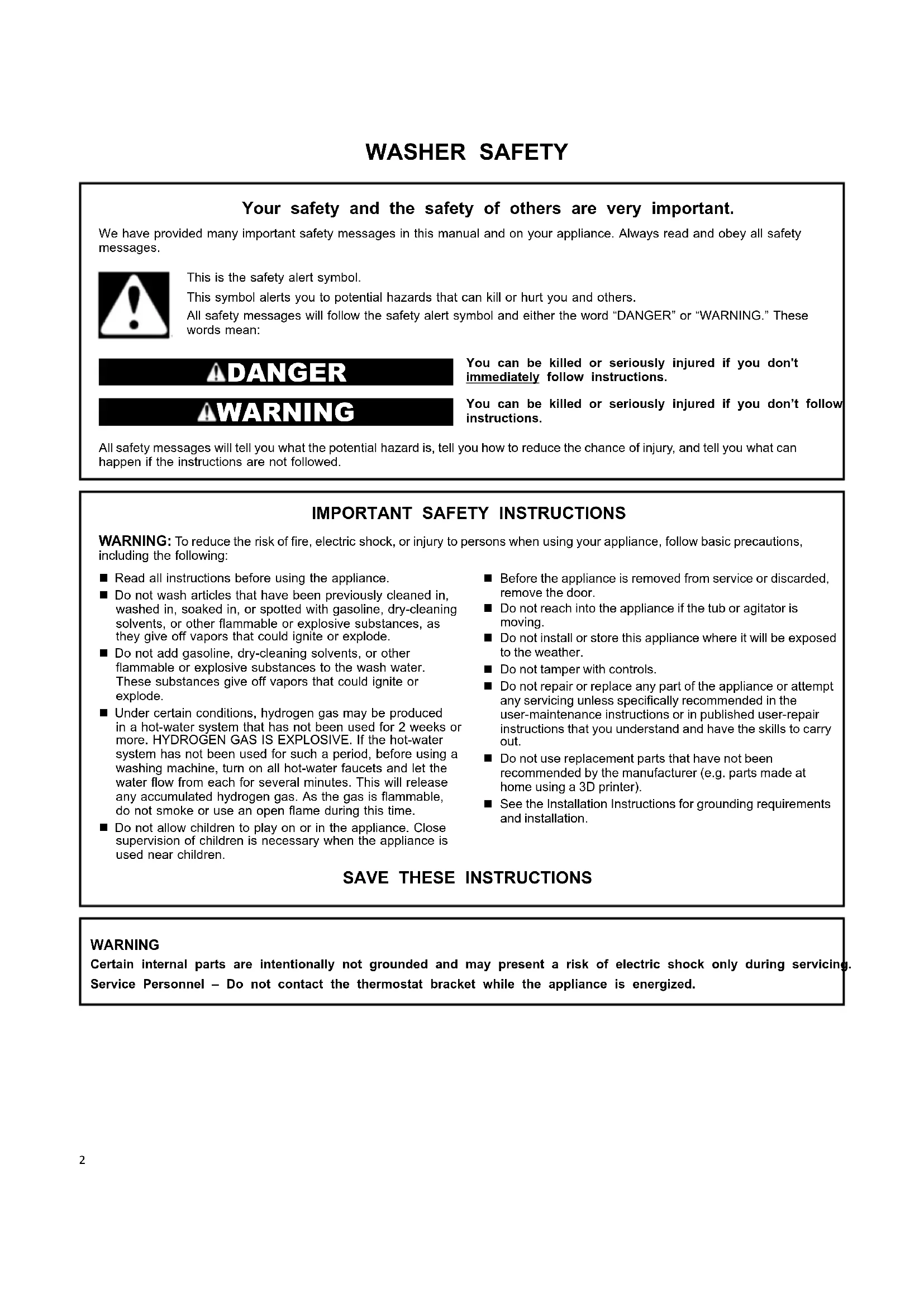 WARNING: To reduce the risk of fire, electric shock, or injury to persons when using your appliance, follow basic precautions, including the following: Read all instructions before using the appliance. Do not wash articles that have been previously cleaned in, washed in, soaked in, or spotted with gasoline, dry-cleaning solvents, or other flammable or explosive substances, as they give off vapors that could ignite or explode. Do not add gasoline, dry-cleaning solvents, or other flammable or explosive substances to the wash water. These substances give off vapors that could ignite or explode. Under certain conditions, hydrogen gas may be produced in a hot-water system that has not been used for 2 weeks or more. HYDROGEN GAS IS EXPLOSIVE. If the hot-water system has not been used for such a period, before using a washing machine, turn on all hot-water faucets and let the water flow from each for several minutes. This will release any accumulated hydrogen gas. As the gas is flammable, do not smoke or use an open flame during this time. Do not allow children to play on or in the appliance. Close supervision of children is necessary when the appliance is used near children. Before the appliance is removed from service or discarded, remove the door. Do not reach into the appliance if the tub or agitator is moving. Do not install or store this appliance where it will be exposed to the weather. Do not tamper with controls. Do not repair or replace any part of the appliance or attempt any servicing unless specifically recommended in the user-maintenance instructions or in published user-repair instructions that you understand and have the skills to carry out. Do not use replacement parts that have not been recommended by the manufacturer (e.g. parts made at home using a 3D printer). See the Installation Instructions for grounding requirements and installation.