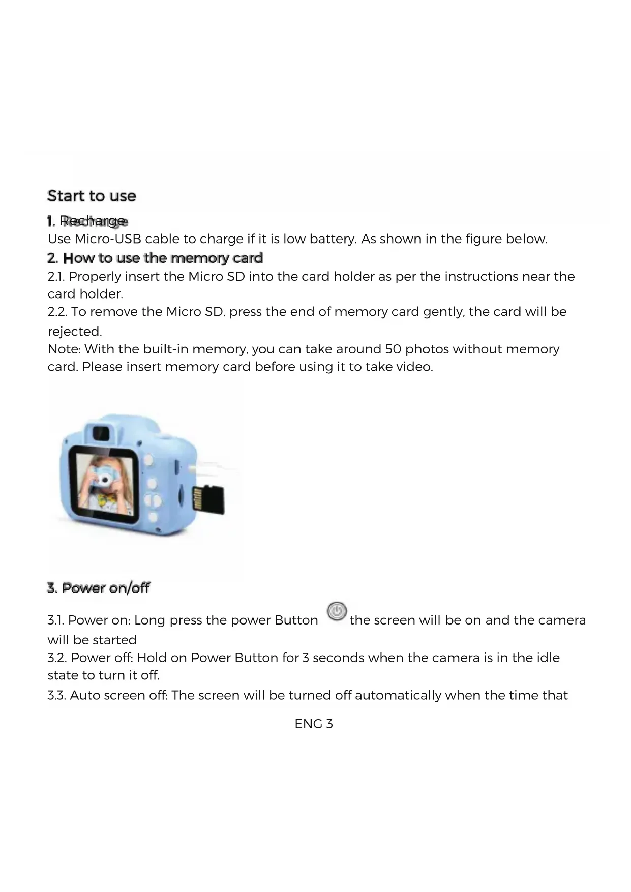 3.1. Power on: Long press the power Button the screen will be on and the camera will be started 3.2. Power off: Hold on Power Button for 3 seconds when the camera is in the idle state to turn it off. 3.3. Auto screen off: The screen will be turned off automatically when the time thatENG 4 the camera is in the idle state for automatic-screen off to save power. 3.4. Power off when the camera is lacking-power. When battery power is very low, an icon will be displayed on the LCD screen, prompting you to charge it in time. When the icon flickers the camera will be turned off automatically.