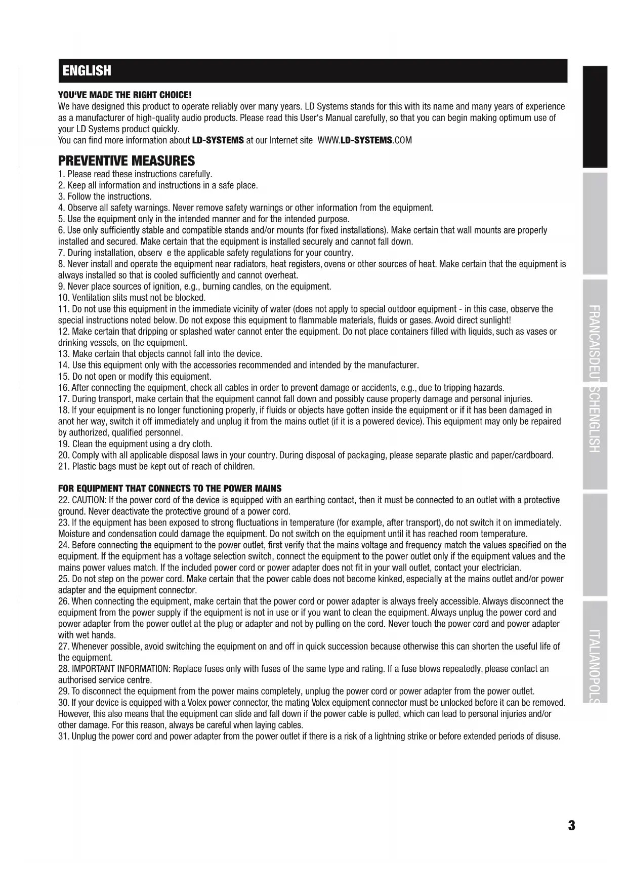 ENGLISH YOU‘VE MADE THE RIGHT CHOICE! We have designed this product to operate reliably over many years. LD Systems stands for this with its name and many years of experience as a manufacturer of high-quality audio products. Please read this User‘s Manual carefully, so that you can begin making optimum use of your LD Systems product quickly. You can find more information about LD-SYSTEMS at our Internet site WWW.LD-SYSTEMS.COM PREVENTIVE MEASURES