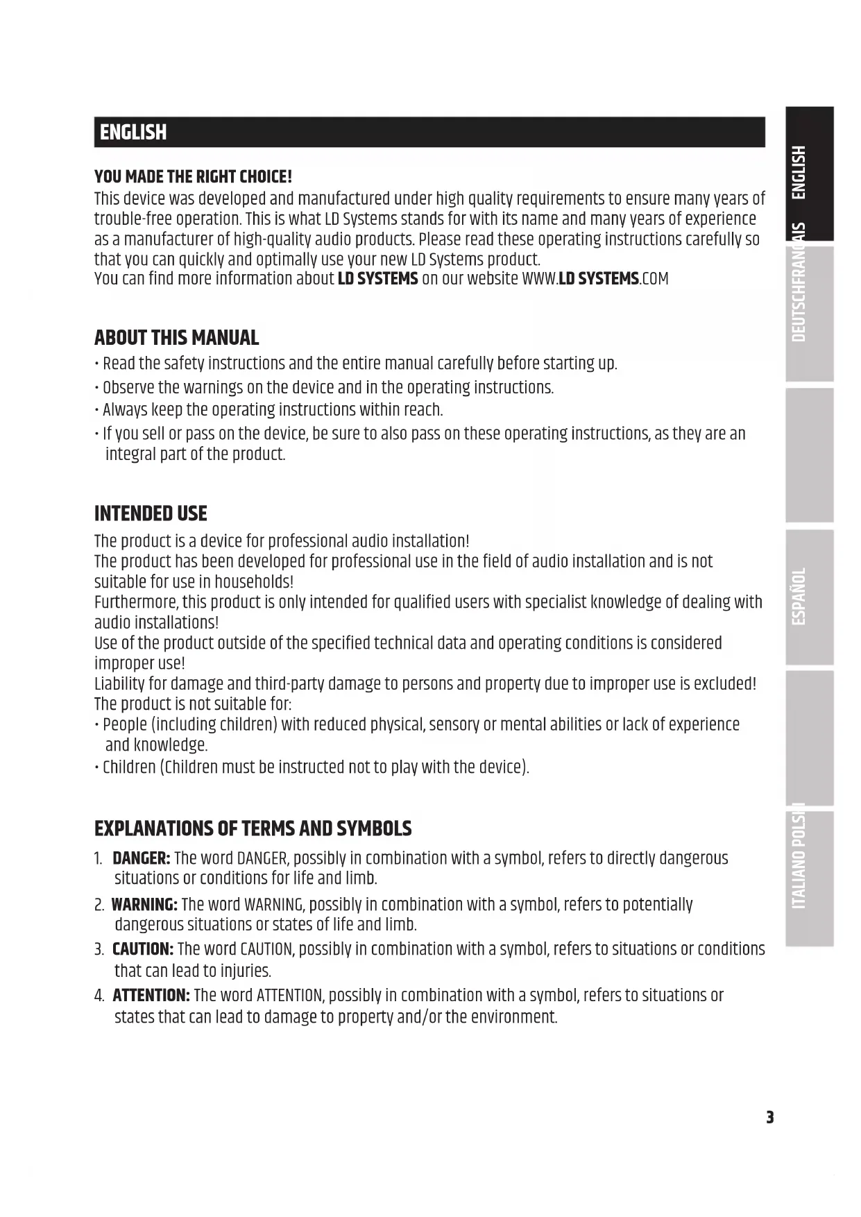 ENGLISH YOU MADE THE RIGHT CHOICE! This device was developed and manufactured under high quality requirements to ensure many years of trouble-free operation. This is what LD Systems stands for with its name and many years of experience as a manufacturer of high-quality audio products. Please read these operating instructions carefully so that you can quickly and optimally use your new LD Systems product. You can find more information about LD SYSTEMS on our website WWW.LD SYSTEMS.COM