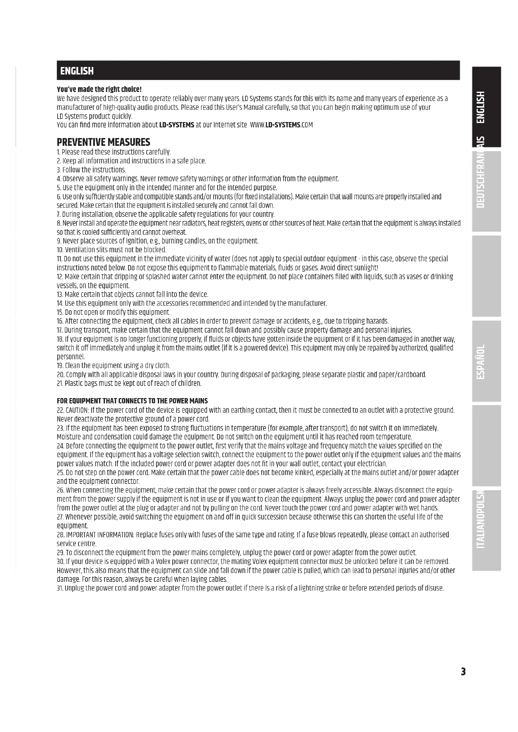 You‘ve made the right choice! We have designed this product to operate reliably over many years. LD Systems stands for this with its name and many years of experience as a manufacturer of high-quality audio products. Please read this User‘s Manual carefully, so that you can begin making optimum use of your LD Systems product quickly. You can nd more information about LD-SYSTEMS at our Internet site WWW.LD-SYSTEMS.COM PREVENTIVE MEASURES