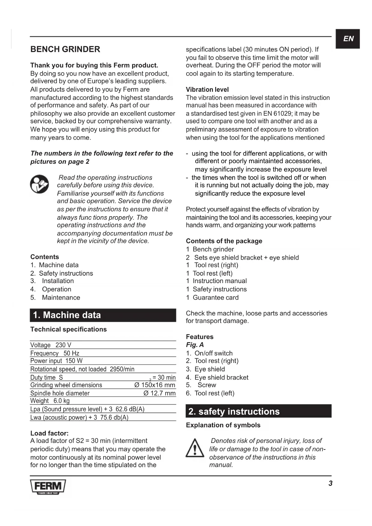 BENCH GRINDER Thank you for buying this Ferm product. By doing so you now have an excellent product, delivered by one of Europe’s leading suppliers. All products delivered to you by Ferm are manufactured according to the highest standards of performance and safety. As part of our philosophy we also provide an excellent customer service, backed by our comprehensive warranty. We hope you will enjoy using this product for many years to come. The numbers in the following text refer to the pictures on page 2 Read the operating instructions carefully before using this device. Familiarise yourself with its functions and basic operation. Service the device as per the instructions to ensure that it always func tions properly. The operating instructions and the accompanying documentation must be kept in the vicinity of the device. Contents