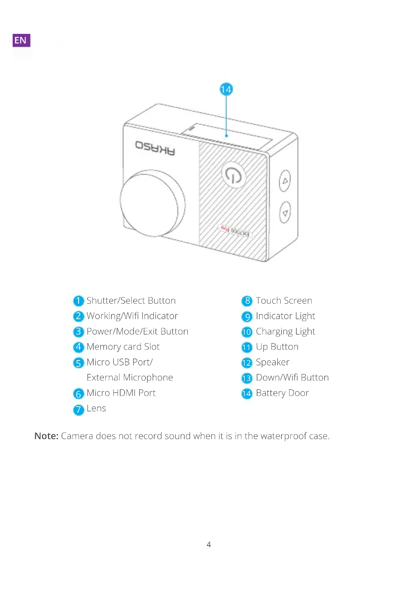 Shutter/Select Button Working/Wifi Indicator Power/Mode/Exit Button Memory card Slot Micro USB Port/ External Microphone Micro HDMI Port Lens Touch Screen Indicator Light Charging Light Up Button Speaker Down/Wifi Button Battery Door Note: Camera does not record sound when it is in the waterproof case.