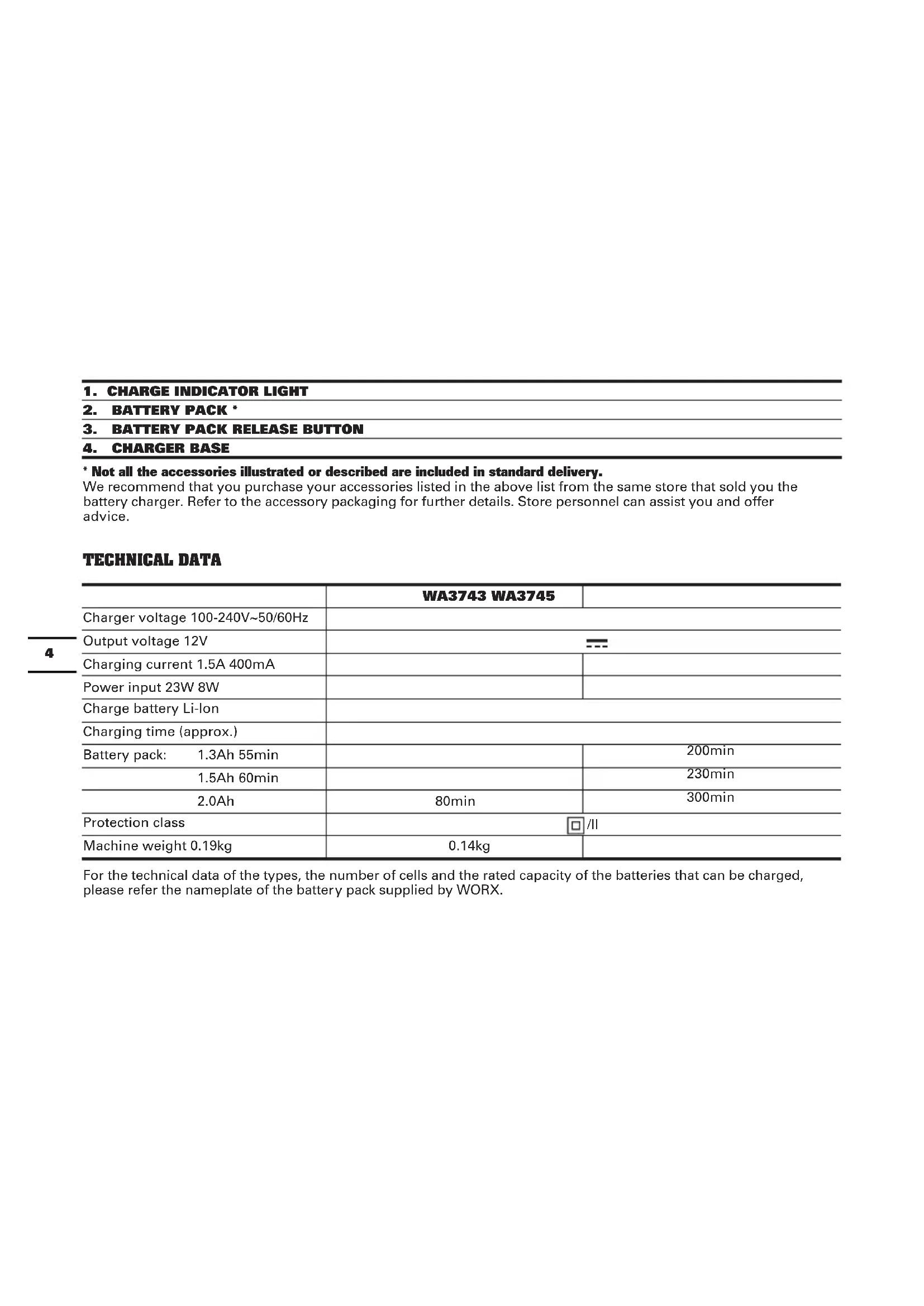 - Not all the accessories illustrated or described are included in standard delivery. We recommend that you purchase your accessories listed in the above list from the same store that sold you the battery charger. Refer to the accessory packaging for further details. Store personnel can assist you and offer advice. TECHNICAL DATA WA3743 WA3745 Charger voltage 100-240V~50/60Hz Output voltage 12V Charging current 1.5A 400mA Power input 23W 8W Charge battery Li-Ion Charging time (approx.) Battery pack: 1.3Ah 55min 200min 1.5Ah 60min 230min 2.0Ah 80min 300min Protection class /II Machine weight 0.19kg 0.14kg For the technical data of the types, the number of cells and the rated capacity of the batteries that can be charged, please refer the nameplate of the battery pack supplied by WORX.5 PRODUCT SAFETY