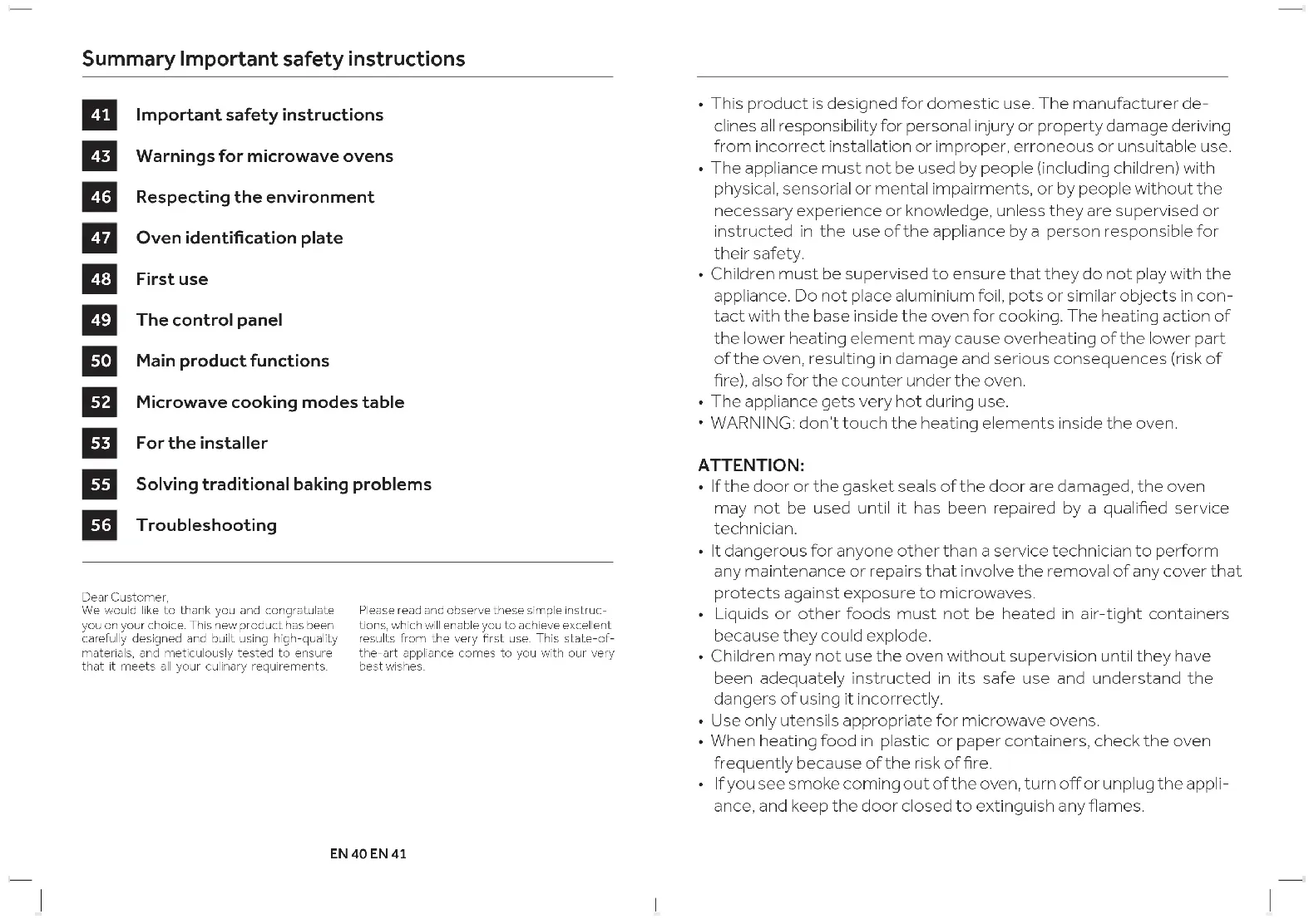 FEHLER RAUCHEN 40 EN 41 Dear Customer, We would like to thank you and congratulate you on your choice. This new product has been carefully designed and built using high-quality materials, and meticulously tested to ensure that it meets all your culinary requirements. Please read and observe these simple instruc- tions, which will enable you to achieve excellent results from the very rst use. This state-of- the-art appliance comes to you with our very best wishes. Important safety instructions Warnings for microwave ovens Respecting the environment Oven identication plate First use The control panel Main product functions Microwave cooking modes table For the installer Solving traditional baking problems Troubleshooting