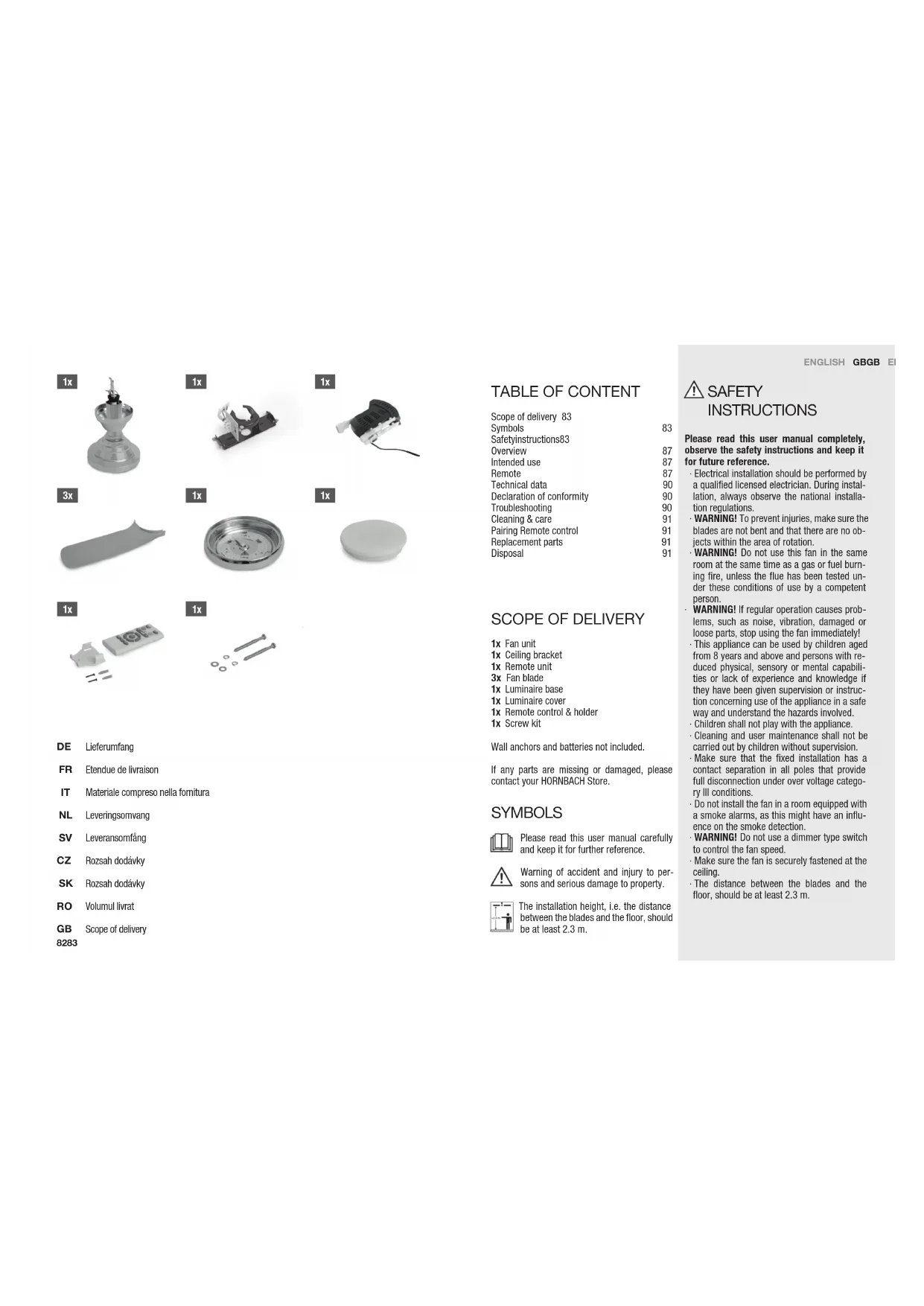 1x Fan unit 1x Ceiling bracket 1x Remote unit 3x Fan blade 1x Luminaire base 1x Luminaire cover 1x Remote control & holder 1x Screw kit Wall anchors and batteries not included. If any parts are missing or damaged, please contact your HORNBACH Store. SYMBOLS Please read this user manual carefully and keep it for further reference. Warning of accident and injury to per- sons and serious damage to property. The installation height, i.e. the distance between the blades and the floor, should be at least 2.3 m. SAFETY INSTRUCTIONS Please read this user manual completely, observe the safety instructions and keep it for future reference.