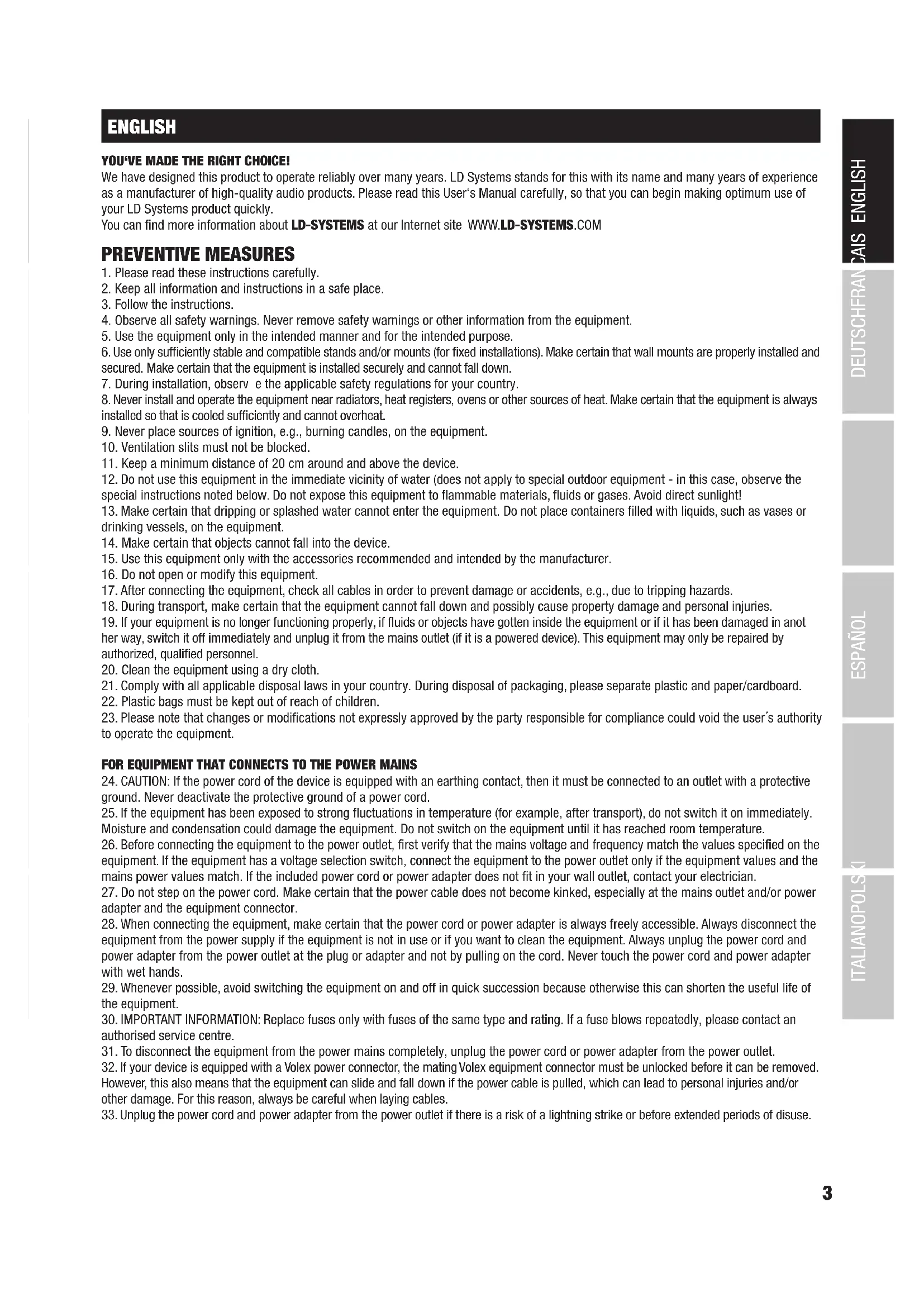 DEUTSCHFRANCAIS ESPAÑOL ENGLISH ITALIANO POLSKI ENGLISH YOU‘VE MADE THE RIGHT CHOICE! We have designed this product to operate reliably over many years. LD Systems stands for this with its name and many years of experience as a manufacturer of high-quality audio products. Please read this User‘s Manual carefully, so that you can begin making optimum use of your LD Systems product quickly. You can find more information about LD-SYSTEMS at our Internet site WWW.LD-SYSTEMS.COM PREVENTIVE MEASURES