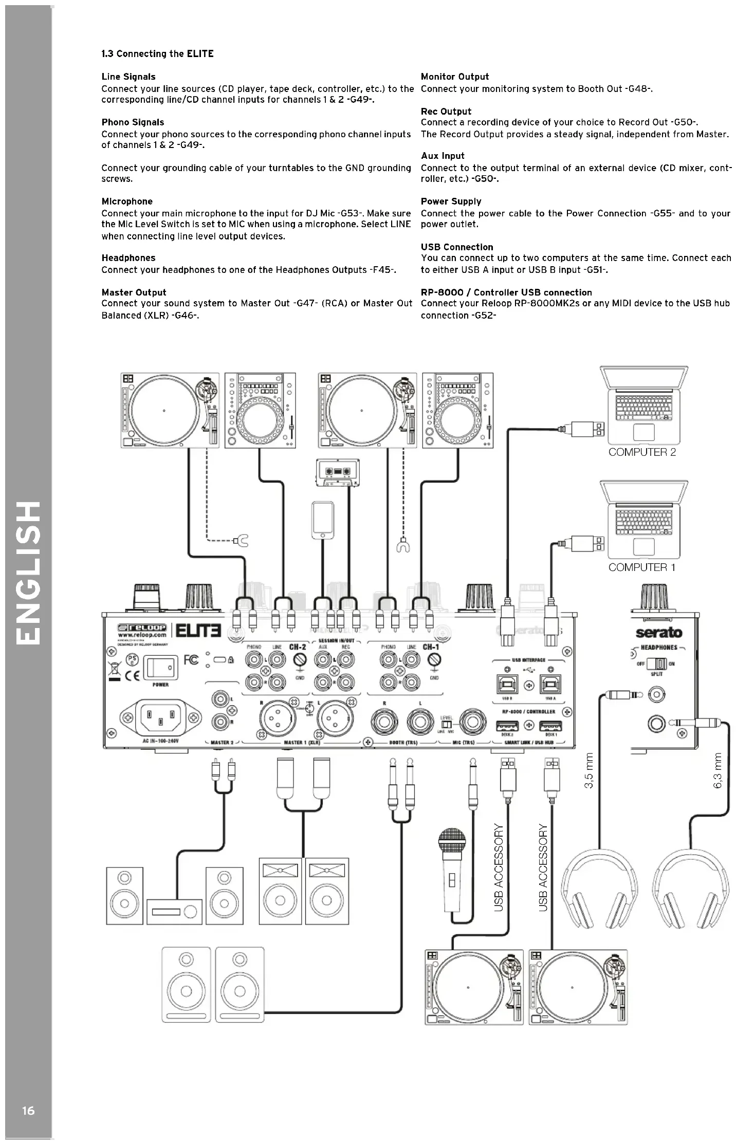 Line Signals Connect your line sources (CD player, tape deck, controller, etc.) to the corresponding line/CD channel inputs for channels 1 & 2 -G49-. Phono Signals Connect your phono sources to the corresponding phono channel inputs of channels 1 & 2 -G49-. Connect your grounding cable of your turntables to the GND grounding screws. Microphone Connect your main microphone to the input for DJ Mic -G53-. Make sure the Mic Level Switch is set to MIC when using a microphone. Select LINE when connecting line level output devices. Headphones Connect your headphones to one of the Headphones Outputs -F45-. Master Output Connect your sound system to Master Out -G47- (RCA) or Master Out Balanced (XLR) -G46-. Monitor Output Connect your monitoring system to Booth Out -G48-. Rec Output Connect a recording device of your choice to Record Out -G50-. The Record Output provides a steady signal, independent from Master. Aux Input Connect to the output terminal of an external device (CD mixer, cont- roller, etc.) -G50-. Power Supply Connect the power cable to the Power Connection -G55- and to your power outlet. USB Connection You can connect up to two computers at the same time. Connect each to either USB A input or USB B input -G51-. RP-8000 / Controller USB connection Connect your Reloop RP-8000MK2s or any MIDI device to the USB hub connection -G52- COMPUTER 2 COMPUTER 1 USB ACCESSORY USB ACCESSORY 6,3 mm 3,5 mm17 ENGLISH