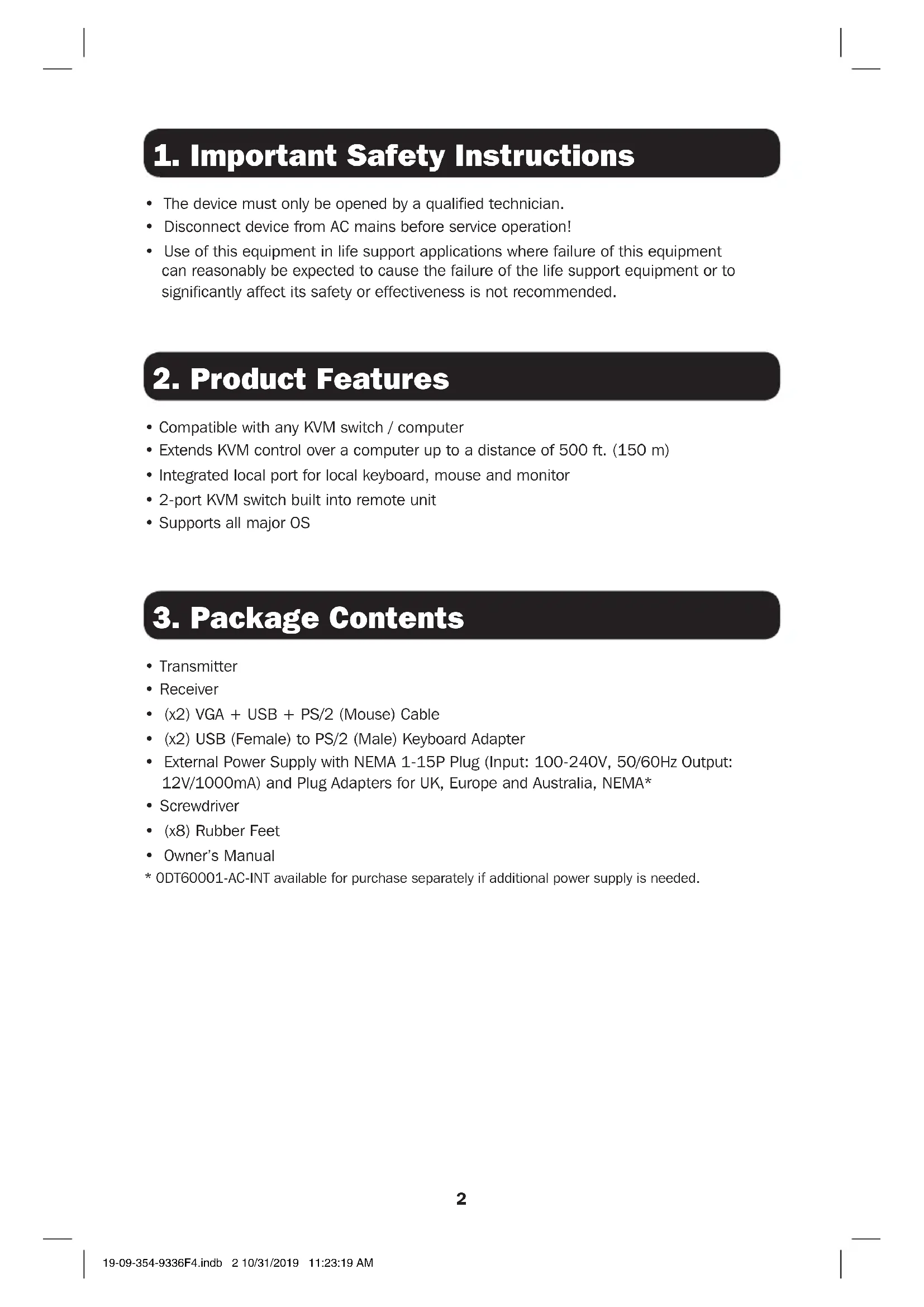 - 0DT60001-AC-INT available for purchase separately if additional power supply is needed. 19-09-354-9336F4.indb 2 10/31/2019 11:23:19 AM3