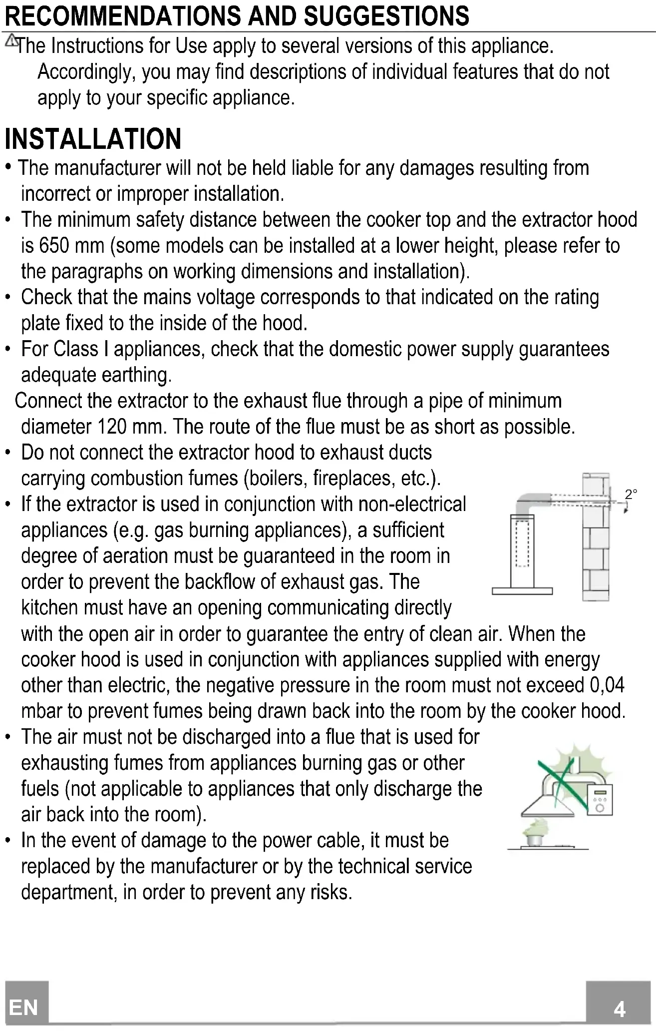 - If the extractor is used in conjunction with non-electrical appliances (e.g. gas burning appliances), a sufficient degree of aeration must be guaranteed in the room in order to prevent the backflow of exhaust gas. The kitchen must have an opening communicating directly with the open air in order to guarantee the entry of clean air. When the cooker hood is used in conjunction with appliances supplied with energy other than electric, the negative pressure in the room must not exceed 0,04 mbar to prevent fumes being drawn back into the room by the cooker hood.