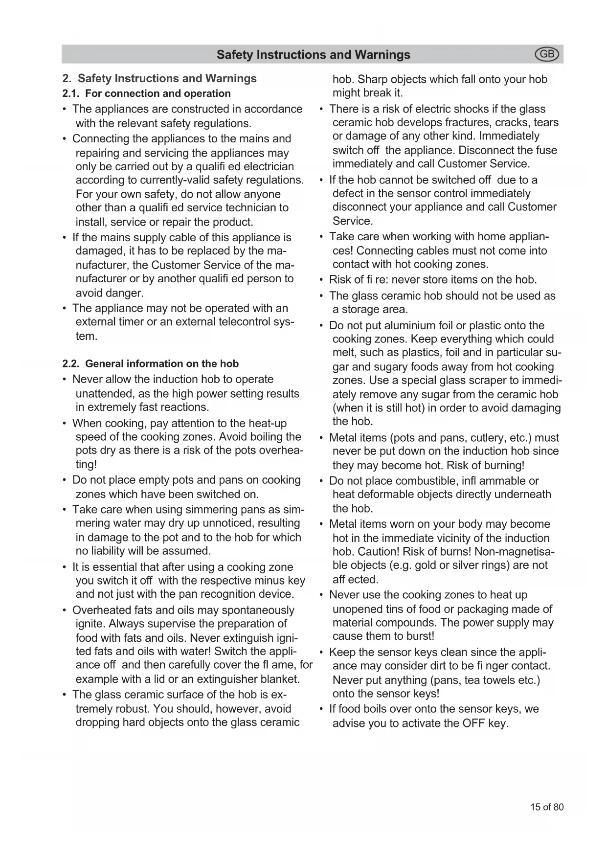 • If the hob cannot be switched off due to a defect in the sensor control immediately disconnect your appliance and call Customer Service.