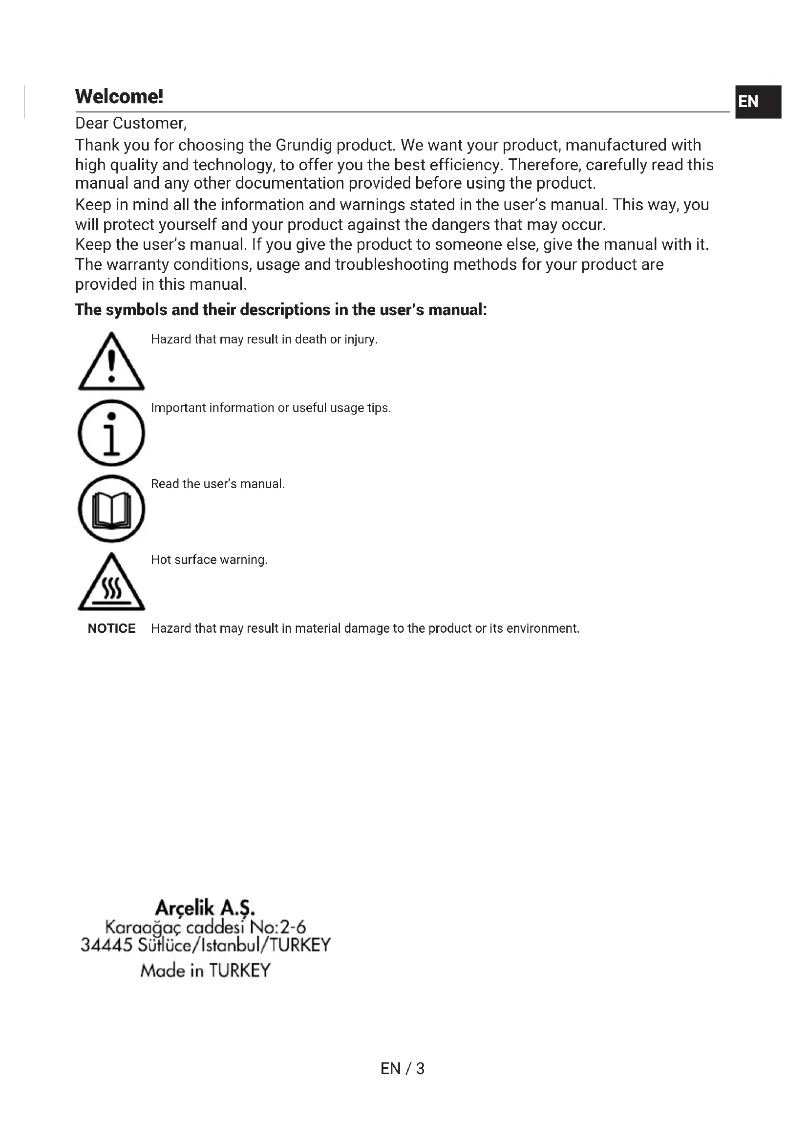 9 Troubleshooting ............................ 31EN / 3 Welcome! Dear Customer, Thank you for choosing the Grundig product. We want your product, manufactured with high quality and technology, to offer you the best efficiency. Therefore, carefully read this manual and any other documentation provided before using the product. Keep in mind all the information and warnings stated in the user’s manual. This way, you will protect yourself and your product against the dangers that may occur. Keep the user’s manual. If you give the product to someone else, give the manual with it. The warranty conditions, usage and troubleshooting methods for your product are provided in this manual. The symbols and their descriptions in the user’s manual: Hazard that may result in death or injury. Important information or useful usage tips. Read the user’s manual. Hot surface warning. NOTICE Hazard that may result in material damage to the product or its environment.