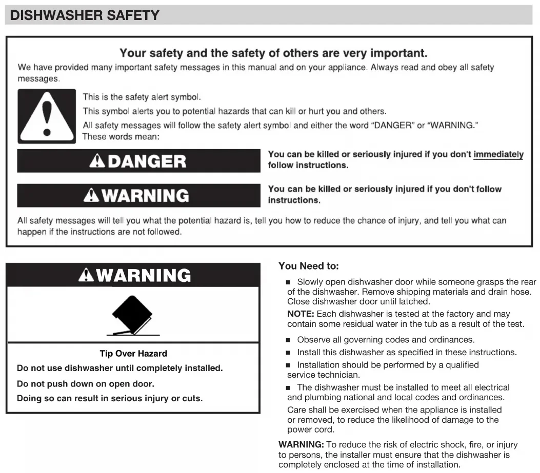 to persons, the installer must ensure that the dishwasher is completely enclosed at the time of installation. WARNING Tip Over Hazard Do not use dishwasher until completely installed. Do not push down on open door. Doing so can result in serious injury or cuts.4 INSTALLATION REQUIREMENTS