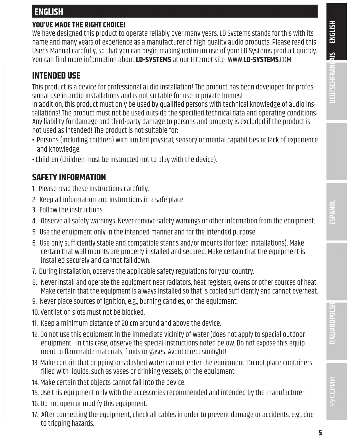 ТЕХНИЧЕСКИЕ ХАРАКТЕРИСТИКИ 137 УТИЛИЗАЦИЯ 140 ДЕКЛАРАЦИИ ПРОИЗВОДИТЕЛЯ 1405 ENGLISH YOU‘VE MADE THE RIGHT CHOICE! We have designed this product to operate reliably over many years. LD Systems stands for this with its name and many years of experience as a manufacturer of high-quality audio products. Please read this User‘s Manual carefully, so that you can begin making optimum use of your LD Systems product quickly. You can find more information about LD-SYSTEMS at our Internet site WWW.LD-SYSTEMS.COM INTENDED USE This product is a device for professional audio installation! The product has been developed for profes- sional use in audio installations and is not suitable for use in private homes! In addition, this product must only be used by qualified persons with technical knowledge of audio ins- tallations! The product must not be used outside the specified technical data and operating conditions! Any liability for damage and third-party damage to persons and property is excluded if the product is not used as intended! The product is not suitable for: