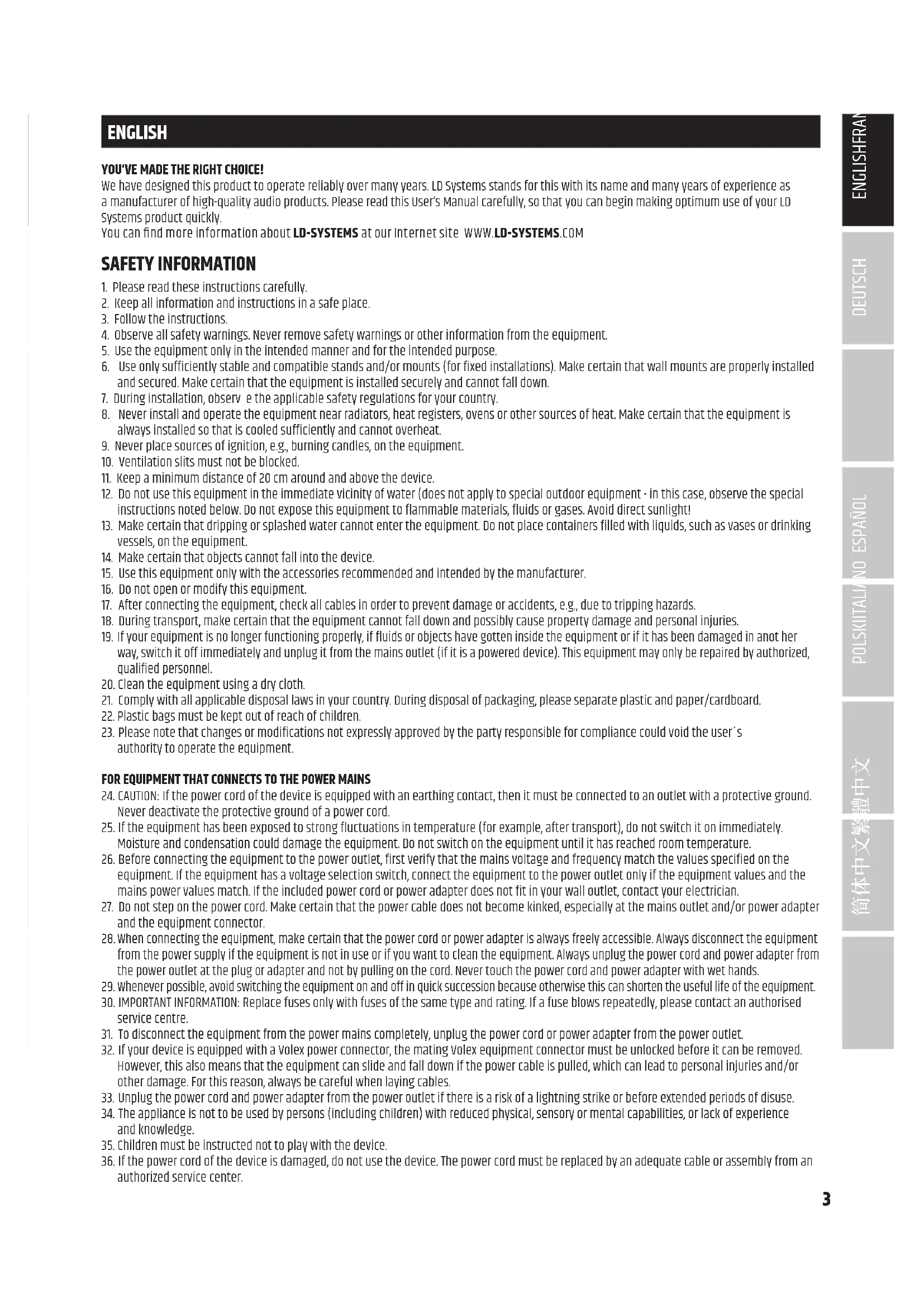 ENGLISH YOU‘VE MADE THE RIGHT CHOICE! We have designed this product to operate reliably over many years. LD Systems stands for this with its name and many years of experience as a manufacturer of high-quality audio products. Please read this User‘s Manual carefully, so that you can begin making optimum use of your LD Systems product quickly. You can nd more information about LD-SYSTEMS at our Internet site WWW.LD-SYSTEMS.COM SAFETY INFORMATION