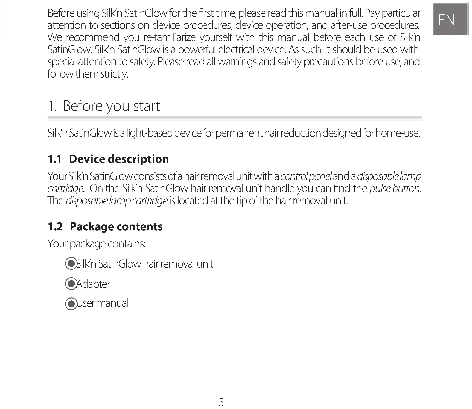 Before using Silk’n SatinGlow for the rst time, please read this manual in full. Pay particular attention to sections on device procedures, device operation, and after-use procedures. We recommend you re-familiarize yourself with this manual before each use of Silk’n SatinGlow. Silk’n SatinGlow is a powerful electrical device. As such, it should be used with special attention to safety. Please read all warnings and safety precautions before use, and follow them strictly.