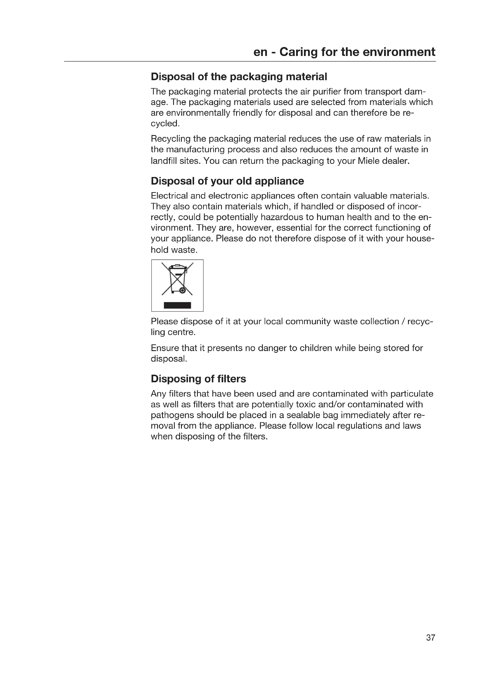 Disposal of the packaging material The packaging material protects the air purifier from transport dam- age. The packaging materials used are selected from materials which are environmentally friendly for disposal and can therefore be re- cycled. Recycling the packaging material reduces the use of raw materials in the manufacturing process and also reduces the amount of waste in landfill sites. You can return the packaging to your Miele dealer. Disposal of your old appliance Electrical and electronic appliances often contain valuable materials. They also contain materials which, if handled or disposed of incor- rectly, could be potentially hazardous to human health and to the en- vironment. They are, however, essential for the correct functioning of your appliance. Please do not therefore dispose of it with your house- hold waste. Please dispose of it at your local community waste collection / recyc- ling centre. Ensure that it presents no danger to children while being stored for disposal. Disposing of filters Any filters that have been used and are contaminated with particulate as well as filters that are potentially toxic and/or contaminated with pathogens should be placed in a sealable bag immediately after re- moval from the appliance. Please follow local regulations and laws when disposing of the filters.en - Caring for the environment