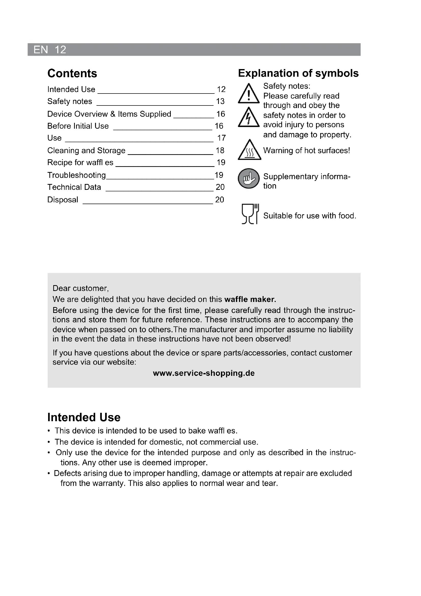 - Defects arising due to improper handling, damage or attempts at repair are excluded from the warranty. This also applies to normal wear and tear. Contents Intended Use __________________________ 12 Safety notes __________________________ 13 Device Overview & Items Supplied _________ 16 Before Initial Use ______________________ 16 Use _________________________________ 17 Cleaning and Storage ___________________ 18 Recipe for waffl es ______________________ 19 Troub lesho oting ________________________ 19 Technical Data ________________________ 20 Disposal _____________________________ 20 Explanation of symbols Safety notes: Please carefully read through and obey the safety notes in order to avoid injury to persons and damage to property. Warning of hot surfaces! Supplementary informa- tion Suitable for use with food. Dear customer, We are delighted that you have decided on this waffl e maker. Before using the device for the fi rst time, please carefully read through the instruc- tions and store them for future reference. These instructions are to accompany the device when passed on to others.The manufacturer and importer assume no liability in the event the data in these instructions have not been observed! If you have questions about the device or spare parts/accessories, contact customer service via our website: www.service-shopping.de13 EN Safety notes ■ This device may be used by children aged 8 and over and by people with reduced physical, sensory or mental abilities or a lack of experience and/or knowledge if they are supervised or have received instruction on how to use the device safely and have understood the dangers resulting from this. ■ Children must not play with the device. ■ Cleaning and user maintenance may not be performed by chil- dren, unless they are older than 8 years of age and are super- vised. ■ Children younger than 8 years of age and animals must be kept away from the device and the mains cord. Warning of hot surfaces! The device will become very hot during use. Make absolutely sure that you do not come into contact with any heated parts during and after use of the device. Only touch the handles while the device is in use or immediately after it has been switched off. We recommend you wear kitchen gloves when handling the device. Only transport or store away the device after it has cooled down completely. The device must not be moved during operation. ■ The device should always be unplugged from the power sup- ply if it is not supervised, and before assembly, disassembly or cleaning. ■ Check the device for damage before each use. If the device, the cable or the plug show visible signs of damage, the device must not be used. Do not use the device if it has malfunctioned or been dropped. You should then have it checked by an author- ised service centre. ■ Do not make any modifi cations to the device. Also do not re- place the mains cord yourself. If the device, the mains cord or the device plug is damaged, it must be replaced by the manufac- turer or customer service or by a similarly qualifi ed person (e.g. qualifi ed workshop) to avoid any risks. ■ The device is not intended to be operated with an external timer or a separate telecontrol system.EN 14 ■ CAUTION: Note the information on cleaning provided in the “Cleaning and Storage” chapter. Risks of injury ■ Keep children and animals away from the device and packaging material! There is a danger of injury and suffocation. ■ CAUTION: Danger of scalding from heat and hot steam! Hot steam may be emitted from the device during operation. You should therefore keep your head and hands out of the danger zone. ■ Make sure that the connected mains cord does not present a trip hazard. The cord must not hang down from the surface on which the device is placed in order to pre- vent the device from being pulled down. ■ Always allow the device to cool off completely before you clean and / or store it. Danger of Electric Shock and Fire ■ Use the device only in enclosed spaces. ■ Do not use the device if highly fl ammable gases are present in the air. Never operate the device in the vicinity of a gas source. ■ Do not cover the device during operation in order to prevent it from catching fi re. Provide adequate ventilation while the device is in operation. ■ Do not place any combustible materials or materials that melt easily (such as card- board, plastic, paper or candles) on or in the device. ■ Never set up or use the device in the vicinity of highly fl ammable materials (curtains, textiles, etc.). ■ Always set up the device with a suffi cient amount of clear space on all sides and clear space above it in order to prevent any build-up of heat. ■ In order to avoid electric shocks, do not use the device near water or other liquids. Set up the device so that the mains cable and the plug cannot come into contact with water or other liquids. ■ Never immerse the device or cable in water or other liquids. If the device falls into water, turn off the power supply immediately. Do not attempt to pull the device out of the water when it is connected to the mains supply! ■ Never touch the device, the mains cord and the mains plug with wet hands when these components are connected to the mains supply. ■ The device should only be connected to a properly installed socket with safety con- tacts. The plug socket must also be readily accessible after connection. The mains voltage must match the technical data of the device. Only use suitable extension cables whose technical data is the same as that of the device. ■ Make sure that the mains cord does not get pinched, kinked or laid over sharp edges and does not come into contact with hot surfaces. ■ Turn the device off and pull the mains plug out of the socket if a fault occurs during operation or before a storm.15 EN Avoiding damage to materials, property and the device ■ Always place the device on a dry, level, fi rm and heat-resistant s