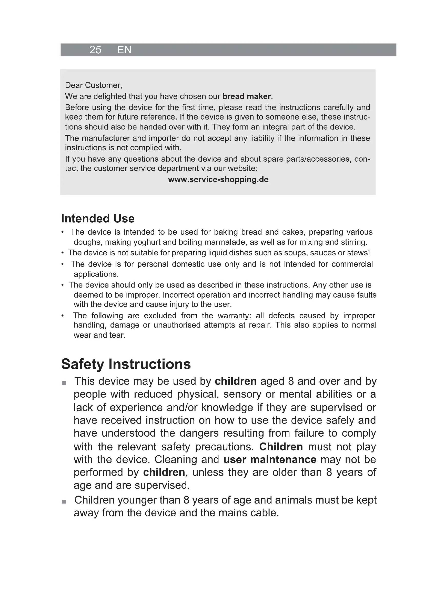 - The following are excluded from the warranty: all defects caused by improper handling, damage or unauthorised attempts at repair. This also applies to normal wear and tear. Safety Instructions ■ This device may be used by children aged 8 and over and by people with reduced physical, sensory or mental abilities or a lack of experience and/or knowledge if they are supervised or have received instruction on how to use the device safely and have understood the dangers resulting from failure to comply with the relevant safety precautions. Children must not play with the device. Cleaning and user maintenance may not be performed by children, unless they are older than 8 years of age and are supervised. ■ Children younger than 8 years of age and animals must be kept away from the device and the mains cable. Dear Customer, We are delighted that you have chosen our bread maker. Before using the device for the fi rst time, please read the instructions carefully and keep them for future reference. If the device is given to someone else, these instruc- tions should also be handed over with it. They form an integral part of the device. The manufacturer and importer do not accept any liability if the information in these instructions is not complied with. If you have any questions about the device and about spare parts/accessories, con- tact the customer service department via our website: www.service-shopping.deEN 26 ■ The device is not designed to be operated with an external timer or a separate remote control system. ■ Do not overfi ll the baking tin. The maximum fi ll volume is: – 400 g of dry ingredients and 220 ml of liquid for different types of bread – 500 g of fruit for marmalade or jam – 600 ml of liquid for yoghurt – 250 g of dry ingredients or 400 ml of liquid for other foods CAUTION: hot surfaces! The device will become very hot during use. It is essential to make sure that heated parts are not touched while using and after using the device. Only touch the handles and control knobs while the device is in operation or immediately after it has been switched off. Only transport or store away the device when it has cooled down completely. Use suitable oven gloves when handling the device. ■ The device must always be disconnected from the mains power when it is left unattended and before assembling, disassem- bling and cleaning the device. ■ In the interest of your own safety, you should inspect the device for damage each time before you use it. Only use it if the device, mains cable and mains plug have no signs of damage! ■ If the device, the mains cable or the mains plug of the device is damaged, it must be replaced by the manufacturer, customer service department or a similarly qualifi ed person (e.g. special- ist workshop) in order to avoid any hazards. ■ CAUTION: Note the cleaning instructions in the “Cleaning” chapter! DANGER – Risk of Electric Shock ■ Use and store the device only in closed rooms. Do not operate the device in rooms with high humidity. ■ Never immerse the device, mains cable or mains plug in water or other liquids and ensure that they cannot fall into water or become wet. ■ Should the device fall into water, switch off the power supply immediately. Do not at- tempt to pull the device out of the water while it is still connected to the mains power!27 EN ■ Never touch the device or the connecting cable with wet hands when these components are connected to the mains power. WARNING – Danger of Injuries! ■ Risk of suffocation! Keep children and animals away from the packaging material. ■ Danger of scalding from heat, hot steam or condensation! Be careful when you open the device. When the device is opened, hot steam can escape. You should therefore keep your head and hands out of the danger zone. We also recommend using oven cloths or kitchen gloves when you want to open the lid or remove the frying basket containing the food. ■ Danger of falling! Make sure that the connected mains cable does not present a trip hazard. ■ The device should only be used and stored out of the reach of children. ■ Keep clothing such as scarves, shawls, ties and long hair away from the device. ■ Always switch off the device before the baking tin is removed from the device. WARNING – Danger of Fire ■ Do not use the device in rooms containing easily ignitable dust or poisonous and explosive fumes. ■ Do not operate the device in a very damp environment or in the vicinity of combustible material. ■ Maintain a suffi cient distance from heat sources such as hobs or ovens in order not to damage the device. Do not place any naked fl ames, e.g. burning candles, in the immediate vicinity of the device, mains cable or mains plug. ■ Never cover the device with cloths or something similar. ■ Do not place any combustible materials (e.g. cardboard, plastic, paper or candles) on or in the device. ■ Make sure that the baking tin is not overfi lled! Overfl owing dough that touches the heating elements may catch fi re! ■ Never put out the fi re using water! If parts of the device catch fi re, disconnect the device from the mains power and smother the fl ames using a damp cloth or a fi re blanket, for example. NOTICE – Risk of Damage to Material and Property ■ Always set up the device with a clear space on all sides (at least 30 cm) and clear space above it (at least 30 cm) on a dry, fl at, solid and heat-resistant surface. ■ Only the accessory parts supplied by the manufacturer should be used. If accessory parts which are not authorised by the manufacturer are used, all warranty and guar- antee claims are void. ■ The device should only be connected to a properly installed socket with safety con- tacts. The socket must also be readily accessible after connection so that the connec- tion to the mains can quickly be isolated. The mains voltage must match the technical data of the device. Only use suitable extension cables whose technical data