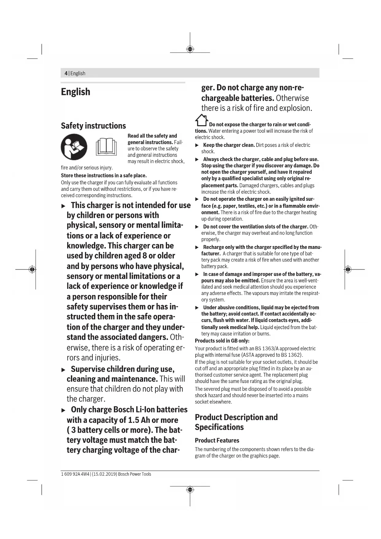 1 609 92A 4W4 | (15.02.2019) Bosch Power Tools| 3 GAL 18V-20 GBA 14,4 V ... GBA 18 V ... ProCORE 18 V ... ProCORE 18 V ... GBA 18 V ... GBA 14,4 V ... (1) (1) (1) (1) (1) (1) (2) (3) (4) Bosch Power Tools 1 609 92A 4W4 | (15.02.2019)4 | English English Safety instructions Read all the safety and general instructions. Fail- ure to observe the safety and general instructions may result in electric shock, fire and/or serious injury. Store these instructions in a safe place. Only use the charger if you can fully evaluate all functions and carry them out without restrictions, or if you have re- ceived corresponding instructions. u This charger is not intended for use by children or persons with physical, sensory or mental limita- tions or a lack of experience or knowledge. This charger can be used by children aged 8 or older and by persons who have physical, sensory or mental limitations or a lack of experience or knowledge if a person responsible for their safety supervises them or has in- structed them in the safe opera- tion of the charger and they under- stand the associated dangers. Oth- erwise, there is a risk of operating er- rors and injuries. u Supervise children during use, cleaning and maintenance. This will ensure that children do not play with the charger. u Only charge Bosch Li-Ion batteries with a capacity of 1. 5 Ah or more ( 3 battery cells or more). The bat- tery voltage must match the bat- tery charging voltage of the char- ger. Do not charge any non-re- chargeable batteries. Otherwise there is a risk of fire and explosion. Do not expose the charger to rain or wet condi- tions. Water entering a power tool will increase the risk of electric shock. u Keep the charger clean. Dirt poses a risk of electric shock. u Always check the charger, cable and plug before use. Stop using the charger if you discover any damage. Do not open the charger yourself, and have it repaired only by a qualified specialist using only original re- placement parts. Damaged chargers, cables and plugs increase the risk of electric shock. u Do not operate the charger on an easily ignited sur- face (e.g. paper, textiles, etc.) or in a flammable envir- onment. There is a risk of fire due to the charger heating up during operation. u Do not cover the ventilation slots of the charger. Oth- erwise, the charger may overheat and no long function properly. u Recharge only with the charger specified by the manu- facturer. A charger that is suitable for one type of bat- tery pack may create a risk of fire when used with another battery pack. u In case of damage and improper use of the battery, va- pours may also be emitted. Ensure the area is well-vent- ilated and seek medical attention should you experience any adverse effects. The vapours may irritate the respirat- ory system. u Under abusive conditions, liquid may be ejected from the battery; avoid contact. If contact accidentally oc- curs, flush with water. If liquid contacts eyes, addi- tionally seek medical help. Liquid ejected from the bat- tery may cause irritation or burns. Products sold in GB only: Your product is fitted with an BS 1363/A approved electric plug with internal fuse (ASTA approved to BS 1362). If the plug is not suitable for your socket outlets, it should be cut off and an appropriate plug fitted in its place by an au- thorised customer service agent. The replacement plug should have the same fuse rating as the original plug. The severed plug must be disposed of to avoid a possible shock hazard and should never be inserted into a mains socket elsewhere. Product Description and Specifications Product Features The numbering of the components shown refers to the dia- gram of the charger on the graphics page. 1 609 92A 4W4 | (15.02.2019) Bosch Power ToolsEnglish | 5 (1) Battery
