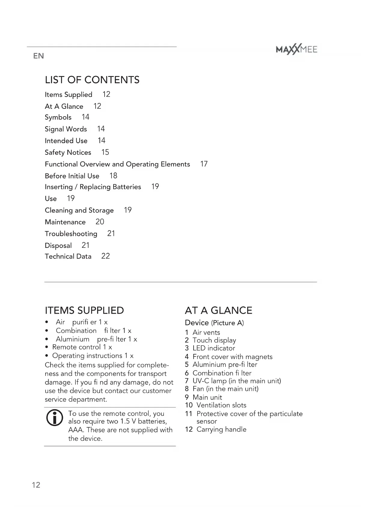 Dear Customer, We are delighted that you have chosen the MAXXMEE High Performance Air Purifi er. The highly effi cient 6-level system uses an integrated HEPA 14 fi lter, combination fi lter, disinfecting UV-C light and a photocatalyst and ionising function to free the air of harmful or polluting components such as particulate matter, pollen, allergens etc. Thanks to the LED strip which shows 4 levels, you can see the particulate concentration for yourself directly. If you have any questions about the device and about spare parts / accessories, contact the customer service department via our website: www.dspro.de/kundenservice We hope you have a lot of fun with your MAXXMEE High Performance Air Purifi er. Information About the Operating Instructions Before using the device for the fi rst time, please read through these operating in- structions carefully and keep them for future reference and other users. They form an integral part of the device. The manufacturer and importer do not accept any liability if the information in these operating instructions is not complied with. IMPORTANT NOTICES! PLEASE KEEP FOR REFERENCE! Touch Display (Picture B) 13 Temperature display – current tem- perature 14 Replace fi lters display – Replace fi lters reminder 15 Particulate display 16 μg / m³ display – Particulate value 17 Fan speed display 18 Fan activity display 19 Display area 20 Control panel 21 Field On / Off – On / Off 22 Field Fan speed – Fan speed 23 Field Timer – Timer 24 Field Auto mode – Automatic mode 25 Field Sleep mode – Sleep mode 26 Field Anion – Ionisation 27 Field UV lamp – UV-C light 28 Field Child lock – Child lock 29 Field Replace fi lters – Reset replace fi lters reminder 30 Child lock display – Child lock active / deactivated 31 Humidity display – Humidity Main Unit (Picture D) 32 Safety switch Main Unit – Side (Picture E) 33 Air inlet of the sensor 34 Air outlet of the sensor 35 Particulate sensor Control panels are shown as follows: Child lock Displays are shown as follows: Temperature Key numbers are shown as follows: (1) Picture references are shown as follows: (Picture A)EN