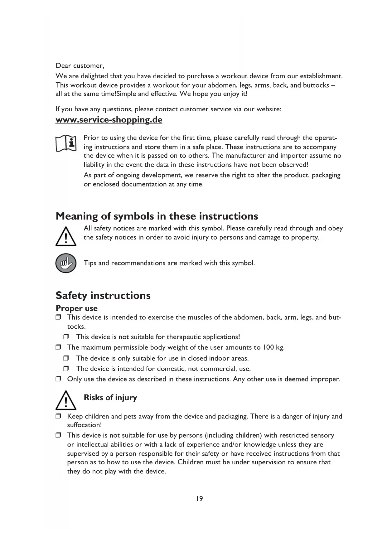 Contents Meaning of symbols in these instructions ____________________________________ 19 Safety instructions ____________________________________________________ 19 Proper use ________________________________________________________ 19 Risks of injury _____________________________________________________ 19 Handling the batteries properly _________________________________________ 20 Notes on use ______________________________________________________ 20 Warranty conditions_________________________________________________ 21 Product contents _____________________________________________________ 22 Parts list _________________________________________________________ 22 Prior to fi rst use _____________________________________________________ 24 Unpacking the device ________________________________________________ 24 Inserting/changing the battery _________________________________________ 24 Assembling the device _______________________________________________ 24 Screws __________________________________________________________ 25 Step 1: Mounting the handle bar ________________________________________ 25 Step 2: Connecting the workout computer ________________________________ 25 Step 3: Mounting the cover on the main frame _____________________________ 25 Step 4: Padding the arm rests __________________________________________ 26 Step 5: Attaching the knee pads ________________________________________ 26 Step 6: Securing the knee pads _________________________________________ 26 Overview of functions _________________________________________________ 26 Operating the workout computer ________________________________________ 27 Use _______________________________________________________________ 27 Before your workout ________________________________________________ 27 Workout _________________________________________________________ 27 After your workout _________________________________________________ 29 Cleaning and storage __________________________________________________ 31 Cleaning _________________________________________________________ 31 Storage __________________________________________________________ 31 Technical data _______________________________________________________ 31 Disposal ___________________________________________________________ 3219 Dear customer, We are delighted that you have decided to purchase a workout device from our establishment. This workout device provides a workout for your abdomen, legs, arms, back, and buttocks – all at the same time!Simple and effective. We hope you enjoy it! If you have any questions, please contact customer service via our website: www.service-shopping.de Prior to using the device for the fi rst time, please carefully read through the operat- ing instructions and store them in a safe place. These instructions are to accompany the device when it is passed on to others. The manufacturer and importer assume no liability in the event the data in these instructions have not been observed! As part of ongoing development, we reserve the right to alter the product, packaging or enclosed documentation at any time. Meaning of symbols in these instructions All safety notices are marked with this symbol. Please carefully read through and obey the safety notices in order to avoid injury to persons and damage to property. Tips and recommendations are marked with this symbol. Safety instructions Proper use ❐ This device is intended to exercise the muscles of the abdomen, back, arm, legs, and but- tocks. ❐ This device is not suitable for therapeutic applications! ❐ The maximum permissible body weight of the user amounts to 100 kg. ❐ The device is only suitable for use in closed indoor areas. ❐ The device is intended for domestic, not commercial, use. ❐ Only use the device as described in these instructions. Any other use is deemed improper. Risks of injury ❐ Keep children and pets away from the device and packaging. There is a danger of injury and suffocation! ❐ This device is not suitable for use by persons (including children) with restricted sensory or intellectual abilities or with a lack of experience and/or knowledge unless they are supervised by a person responsible for their safety or have received instructions from that person as to how to use the device. Children must be under supervision to ensure that they do not play with the device.20 ❐ Do not use the device if it is damaged. ❐ Be sure to perform adequate warm up exercises before using the device (see chapter “Before your workout”). ❐ Start the exercises slowly and then gradually increase the intensity. We expressly point out that using the device improperly or exercising too intensively could be hazardous to your health. For this reason, do not overdo it and do not overestimate yourself. ❐ The device may only be used by one person at a time. ❐ If you belong to a health risk group, have not exercised for a longer period of time, have a cardiovascular or orthopaedic condition, you should consult your physician before us- ing the device. If applicable, consult your workout plan with him/her. ❐ Pregnant persons are not allowed to use the device or only after having consulted their physician. ❐ Immediately stop your workout if you feel weak or dizzy. In the event of nausea, pain in the chest or limbs, heart palpation or other symptoms, please immediately contact a physician. ❐ Make sure that the training area is well ventilated during your workout. ❐ Do not work out directly after a meal or after consuming alcohol. ❐ When working out, wear comfortable clothing and non-slip gym shoes. Do not use the device without clothing. ❐ Ensure that your clothing is not too wide to prevent it from catching in the device’s mov- ing parts. ❐ If you have long hair, be sure to wear it up before working out so that there is no risk of it catching in the device. Remove any jewellery. Handling the batteries properly ❐ Before inserting the battery, make sur