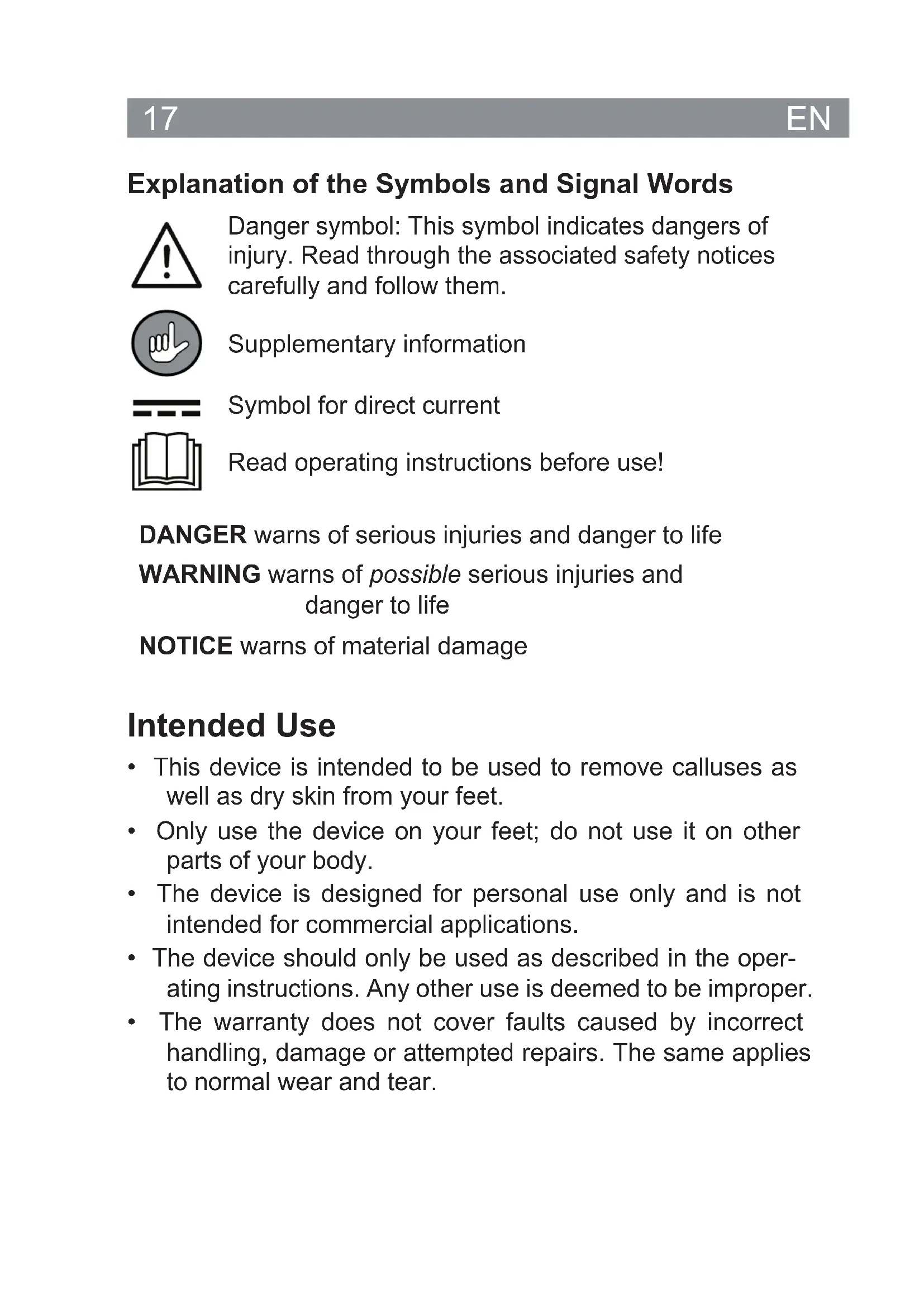 on fi rmly. It must engage audibly. Use PLEASE NOTE! ■ The device should only be used with a correctly applied attachment! ■ Only use the device on uninjured calluses on your feet. ■ Do not use the device on tender, soft skin. ■ Do not press the attachment against the skin with force. It could be injured. ■ From time to time, check the area you are treating to avoid penetrating your skin too deeply and causing injuries. Do not hold the attachment on one spot for longer than 2 to 3 seconds. ■ If you experience an unpleasant sensation while you are using the device, stop applying it immediately!25 EN Removal of Calluses For dr