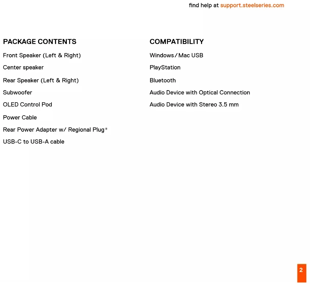1 Connect the Speaker Cables (L & R) (2) to the Speaker Inputs (L & R) (14) on the Subwoofer. 2 Connect the Speaker Cable (C) (13) to the Speaker Input (C) (21) on the Subwoofer. 3 Connect the To Subwoofer Cable (24) to the OLED Control Pod Input (18) on the Subwoofer. 4 Connect the USB-C to USB-A Cable (30) from Subwoofer's USB-C PC Input (15) to your PC. 5 Plug the Power Cable (31) into your Subwoofer's Power Cable Input (23) and then plug into matching power source. More detailed product information at steelseries.com/setup/arena-9 REAR SPEAKERS 6 Plug the Left Speaker’s attached cable (labeled To Right Speaker Cable (11)) into the Left Speaker Audio Input (8). 7 Attach the Regional Plug to the Rear Speaker Power Adapter (32) and plug it into the Power Input (9). Plug the Wall Adapter into an appropriate power source. COMPLETE SETUP 8 Turn Power Switch (16) to on. 9 Select Arena 9 as your 5.1 Surround Playback source.25