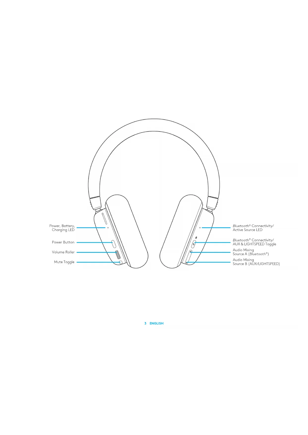 After connecting to both LIGHTSPEED and AUX, togglebetween LIGHTSPEED and AUX options by pressing the connectivity button on the right ear cup. When LIGHTSPEED is active, the LED light above thebutton will light up cyan for 5 seconds. When AUX is active, the LED light will light up white for5 seconds. AUX only available when a cable is connected.A