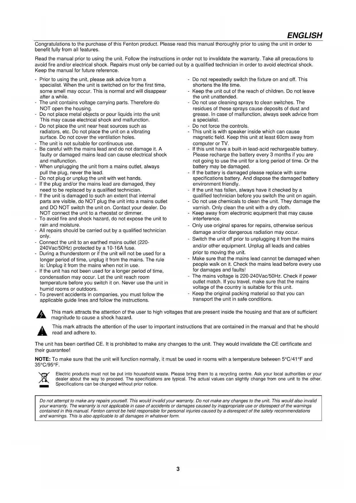 V1.123 ENGLISH Congratulations to the purchase of this Fenton product. Please read this manual thoroughly prior to using the unit in order to benefit fully from all features. Read the manual prior to using the unit. Follow the instructions in order not to invalidate the warranty. Take all precautions to avoid fire and/or electrical shock. Repairs must only be carried out by a qualified technician in order to avoid electrical shock. Keep the manual for future reference. - Prior to using the unit, please ask advice from a specialist. When the unit is switched on for the first time, some smell may occur. This is normal and will disappear after a while. - The unit contains voltage carrying parts. Therefore do NOT open the housing. - Do not place metal objects or pour liquids into the unit This may cause electrical shock and malfunction. - Do not place the unit near heat sources such as radiators, etc. Do not place the unit on a vibrating surface. Do not cover the ventilation holes. - The unit is not suitable for continuous use. - Be careful with the mains lead and do not damage it. A faulty or damaged mains lead can cause electrical shock and malfunction. - When unplugging the unit from a mains outlet, always pull the plug, never the lead. - Do not plug or unplug the unit with wet hands. - If the plug and/or the mains lead are damaged, they need to be replaced by a qualified technician. - If the unit is damaged to such an extent that internal parts are visible, do NOT plug the unit into a mains outlet and DO NOT switch the unit on. Contact your dealer. Do NOT connect the unit to a rheostat or dimmer. - To avoid fire and shock hazard, do not expose the unit to rain and moisture. - All repairs should be carried out by a qualified technician only. - Connect the unit to an earthed mains outlet (220- 240Vac/50Hz) protected by a 10-16A fuse. - During a thunderstorm or if the unit will not be used for a longer period of time, unplug it from the mains. The rule is: Unplug it from the mains when not in use. - If the unit has not been used for a longer period of time, condensation may occur. Let the unit reach room temperature before you switch it on. Never use the unit in humid rooms or outdoors. - To prevent accidents in companies, you must follow the applicable guide lines and follow the instructions. - Do not repeatedly switch the fixture on and off. This shortens the life time. - Keep the unit out of the reach of children. Do not leave the unit unattended. - Do not use cleaning sprays to clean switches. The residues of these sprays cause deposits of dust and grease. In case of malfunction, always seek advice from a specialist. - Do not force the controls. - This unit is with speaker inside which can cause magnetic field. Keep this unit at least 60cm away from computer or TV. - If this unit have a built-in lead-acid rechargeable battery. Please recharge the battery every 3 months if you are not going to use the unit for a long period of time. Or the battery may be damaged. - If the battery is damaged please replace with same specifications battery. And dispose the damaged battery environment friendly. - If the unit has fallen, always have it checked by a qualified technician before you switch the unit on again. - Do not use chemicals to clean the unit. They damage the varnish. Only clean the unit with a dry cloth. - Keep away from electronic equipment that may cause interference. - Only use original spares for repairs, otherwise serious damage and/or dangerous radiation may occur. - Switch the unit off prior to unplugging it from the mains and/or other equipment. Unplug all leads and cables prior to moving the unit. - Make sure that the mains lead cannot be damaged when people walk on it. Check the mains lead before every use for damages and faults! - The mains voltage is 220-240Vac/50Hz. Check if power outlet match. If you travel, make sure that the mains voltage of the country is suitable for this unit. - Keep the original packing material so that you can transport the unit in safe conditions. This mark attracts the attention of the user to high voltages that are present inside the housing and that are of sufficient magnitude to cause a shock hazard. This mark attracts the attention of the user to important instructions that are contained in the manual and that he should read and adhere to. The unit has been certified CE. It is prohibited to make any changes to the unit. They would invalidate the CE certificate and their guarantee! NOTE: To make sure that the unit will function normally, it must be used in rooms with a temperature between 5°C/41°F and 35°C/95°F. Electric products must not be put into household waste. Please bring them to a recycling centre. Ask your local authorities or your dealer about the way to proceed. The specifications are typical. The actual values can slightly change from one unit to the other. Specifications can be changed without prior notice.