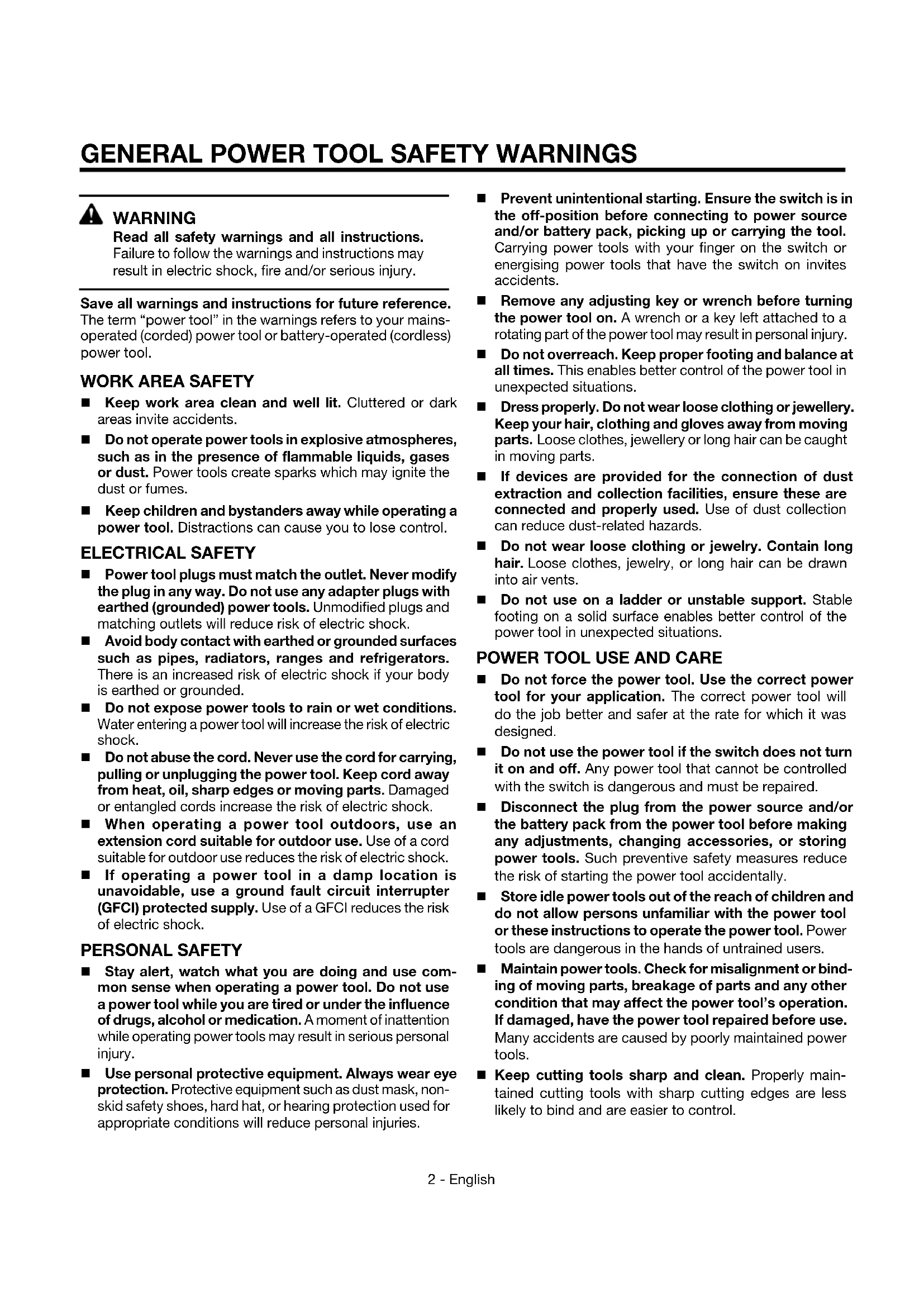 Do not force the power tool. Use the correct power tool for your application. The correct power tool will do the job better and safer at the rate for which it was designed. Do not use the power tool if the switch does not turn it on and off. Any power tool that cannot be controlled with the switch is dangerous and must be repaired. Disconnect the plug from the power source and/or the battery pack from the power tool before making any adjustments, changing accessories, or storing power tools. Such preventive safety measures reduce the risk of starting the power tool accidentally. Store idle power tools out of the reach of children and do not allow persons unfamiliar with the power tool or these instructions to operate the power tool. Power tools are dangerous in the hands of untrained users. Maintain power tools. Check for misalignment or bind- ing of moving parts, breakage of parts and any other condition that may affect the power tool’s operation. If damaged, have the power tool repaired before use. Many accidents are caused by poorly maintained power tools. Keep cutting tools sharp and clean. Properly main- tained cutting tools with sharp cutting edges are less likely to bind and are easier to control.3 - English