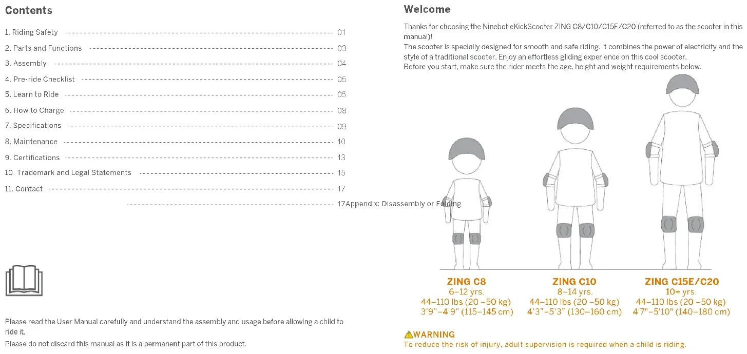 Electromagnetic Compatibility Directive Ninebot (Changzhou) Tech Co., Ltd. hereby declares that the product listed in this section comply with the essential requirements and other relevant provisions of the Electromagnetic Compatibility Directive 2014/30/EU. The Safety of Toy Directive Ninebot (Changzhou) Tech Co., Ltd. hereby declares that the product listed in this section comply with the essential requirements and other relevant provisions of The Safety of Toy Directive 2009/48/EC. Restriction of the use of certain hazardous substances (RoHS) Directive Ninebot (Changzhou) Tech Co., Ltd. hereby declares the whole product including parts (cables, cords, and so on) meets the requirements of RoHS Directive 2011/65/EU and amendment Commission Delegated Directive (EU) 2015/863 on the restriction of the use of certain hazardous substances in electrical and electronic equipment ("RoHS recast" or "RoHS 2.0"). Ninebot (Changzhou) Tech Co., Ltd. hereby declares that the product model: ZING C8, ZING C10, ZING C15E, ZING C20 comply with the essential requirements and other relevant provisions of the Electromagnetic Compatibility 2014/30/EU, The Safety of Toy Directive 2009/48/EC and the RoHS Directive 2011/65/EU and amendment Commission Delegated Directive (EU) 2015/863. Ninebot (Changzhou) Tech Co., Ltd. hereby declares that the product model:ZING C8, ZING C10, ZING C15E, ZING C20 comply with the essential requirements and other relevant provisions of Electromagnetic Compatibility Regulations 2016, Toys (Safety) Regulations 2011 and The Restriction of the Use of Certain Hazardous Substances in Electrical and Electronic Equipment Regulations 2012. The declaration of conformity can be viewed at the following address: http://eu-en.segway.com/support-instructions EU Authorised Representative: Segway-Ninebot Europe Dynamostraat 7, 1014 BN Amsterdam, The Netherlands UK Authorised Representative:UKCA Experts Ltd. Dept 302, 43 Owston Road Carcroft, Doncaster, DN6 8DA, United Kingdom1615 Ninebot is the registered trademark of Ninebot (Beijing) Tech. Co., Ltd; Segway and the Rider Design are the registered trademarks of Segway Inc.; The respective owners reserve the rights of their trademarks referred to in this manual. We have attempted to include description and instruction for all the functions of the Ninebot eKickScooter at the time of printing. However, due to constant improvement of product features and changes of design, your scooter may differ slightly from the one shown in this document. Visit www.segway.com to download the latest user materials. Please note that there are multiple Segway and Ninebot models with different functions, and some of the functions mentioned herein may not applicable to your unit. The manufacturer reserves the right to change the design and functionality of the scooter product and documentation without prior notice. ©2022 Ninebot (Beijing) Tech Co., Ltd. All rights reserved. Legal Statement IMPORTANT: Ninebot ekickScooter (the “product”) is an off road product rather than a means for transportation. Be aware, the user shall agree to read the entire user manual and fully understand its content (especially the parts related to the safety riding).