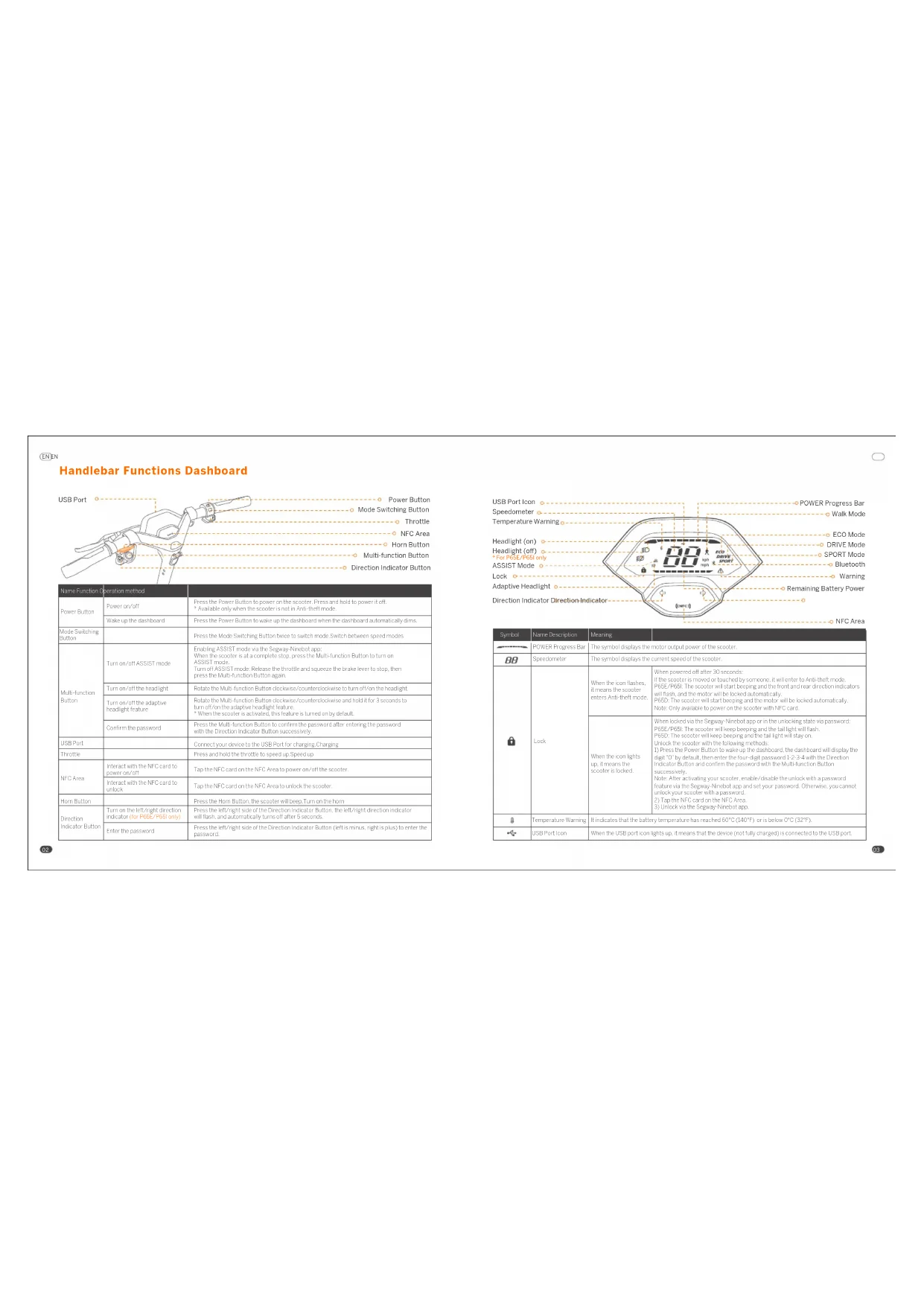 - When the scooter is activated, this feature is turned on by default. Press the Multi-function Button to confirm the password after entering the password with the Direction Indicator Button successively. Connect your device to the USB Port for charging.Charging Throttle Press and hold the throttle to speed up.Speed up Horn Button Press the Horn Button, the scooter will beep.Turn on the horn Direction Indicator Button Press the left/right side of the Direction Indicator Button, the left/right direction indicator will flash, and automatically turns off after 5 seconds. Press the left/right side of the Direction Indicator Button (left is minus, right is plus) to enter the password. Turn on the left/right direction indicator (for P65E/P65I only) Enter the password Mode Switching Button Press the Mode Switching Button twice to switch mode.Switch between speed modes NFC Area Tap the NFC card on the NFC Area to power on/off the scooter. Tap the NFC card on the NFC Area to unlock the scooter. Interact with the NFC card to power on/off Interact with the NFC card to unlock The symbol displays the motor output power of the scooter. Symbol The symbol displays the current speed of the scooter. Meaning Name Description POWER Progress Bar Speedometer Lock When locked via the Segway-Ninebot app or in the unlocking state via password: P65E/P65I: The scooter will keep beeping and the tail light will flash. P65D: The scooter will keep beeping and the tail light will stay on. Unlock the scooter with the following methods:
