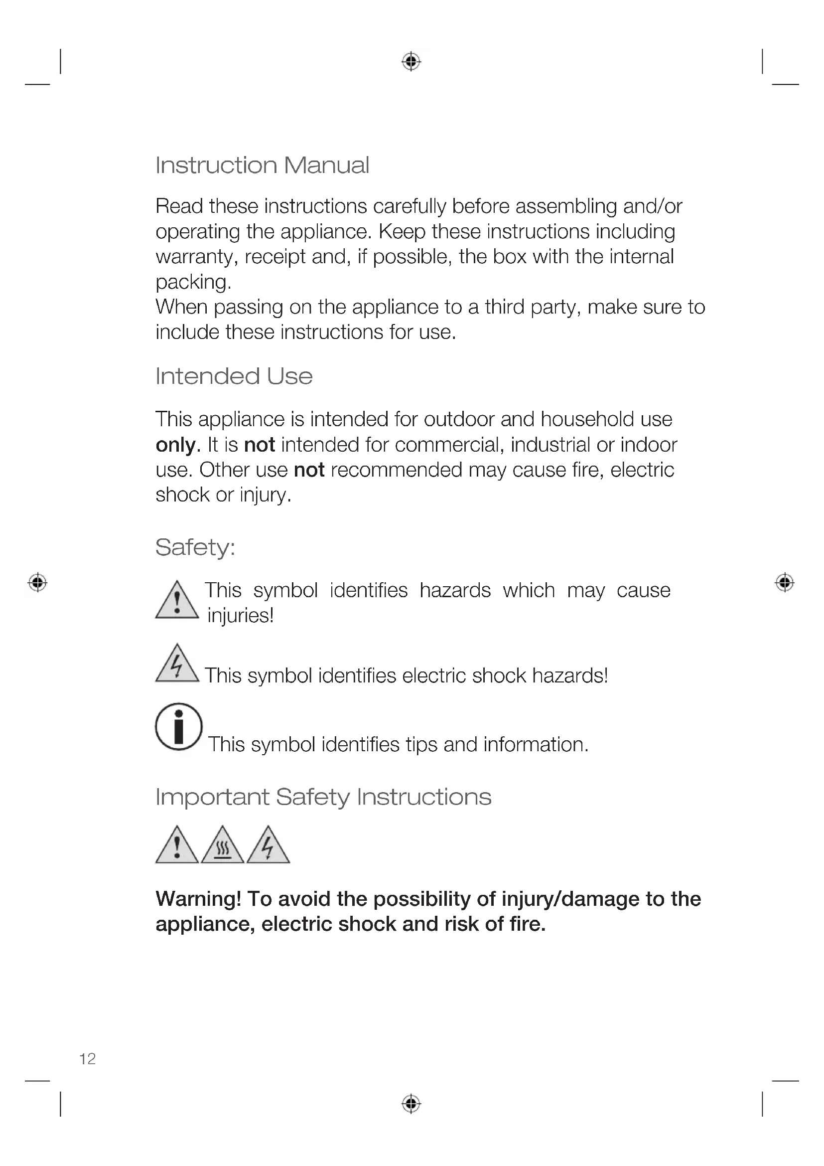 - Only use the appliance for its intended purpose, outdoor use only, and as described in this manual.