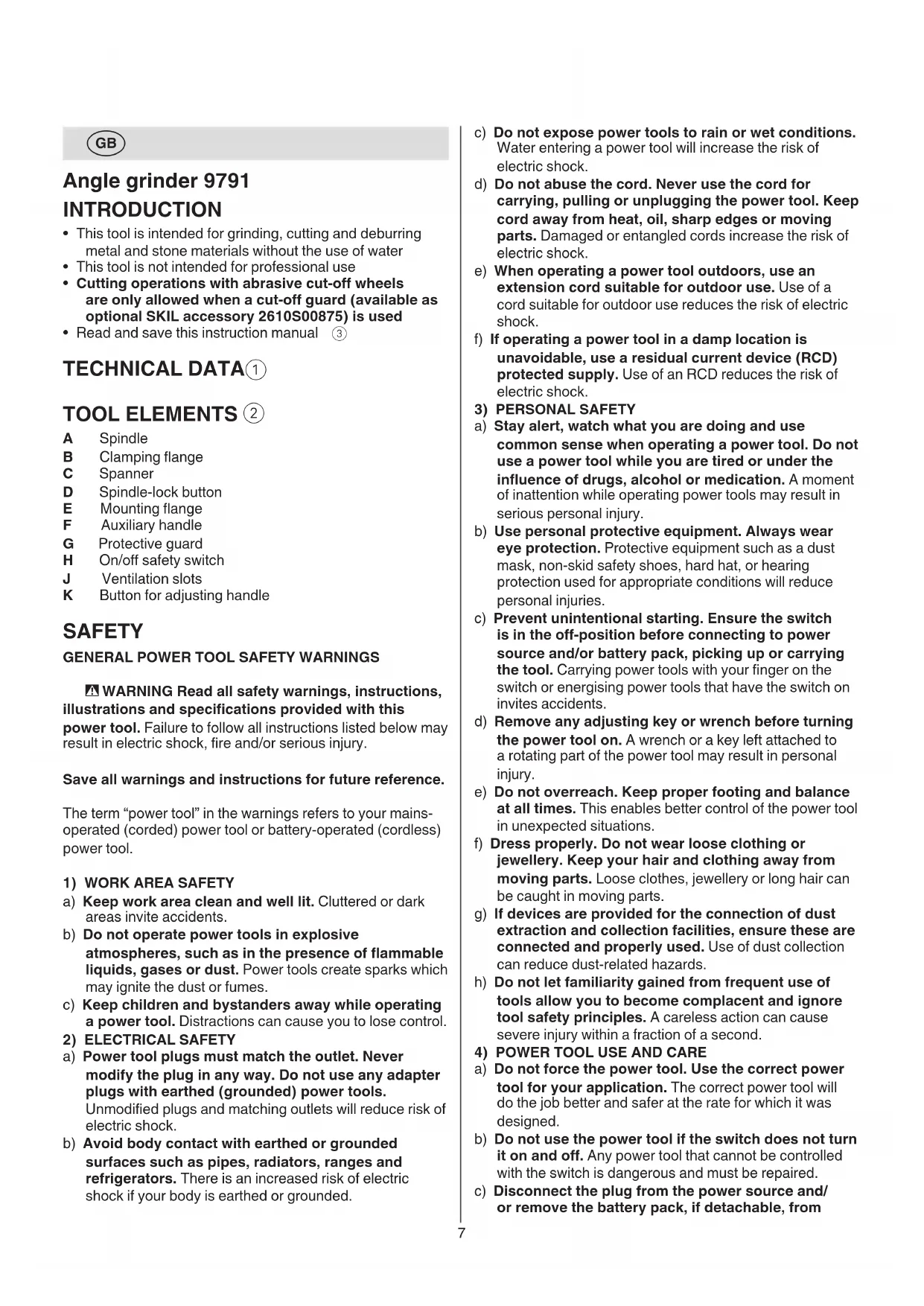 A Spindle B Clamping ange C Spanner D Spindle-lock button E Mounting ange F Auxiliary handle G Protective guard H On/o safety switch J Ventilation slots K Button for adjusting handle SAFETY