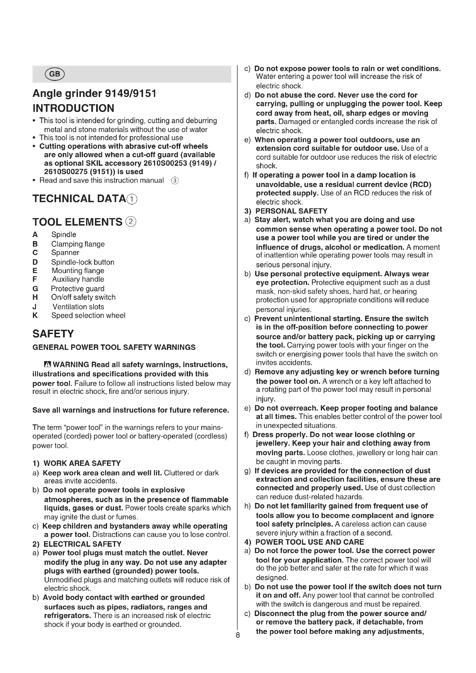 - Cutting operations with abrasive cut-o wheels are only allowed when a cut-o guard (available as optional SKIL accessory 2610S00253 (9149) / 2610S00275 (9151)) is used